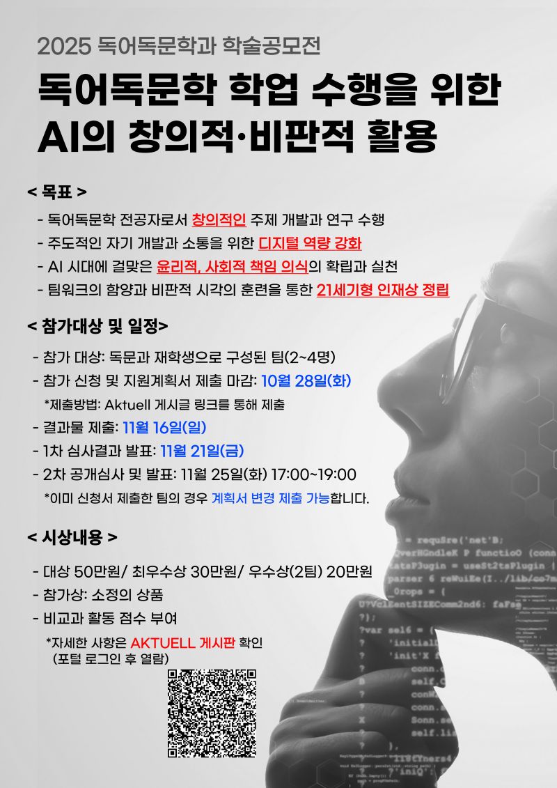[학술공모전] 2025 독어독문학과 학술공모전-'독어독문학 학업 수행을 위한 AI의 창의적.비판적 활용'(신청 및 제출 기간 연장)