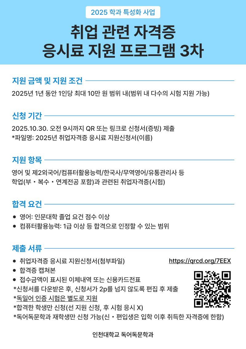 [학과특성화사업]2025 취업관련자격증 취득 지원(3차)(~2025.10.30. 09:00)