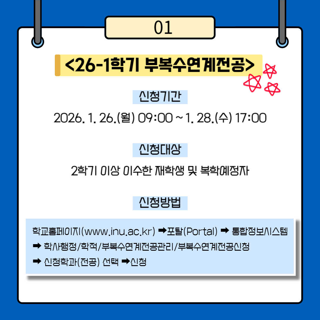 [학사안내] 2026-1학기 부.복수.연계전공 신청 안내(2026.1.26.(월) 09:00~1.28.(수) 17:00