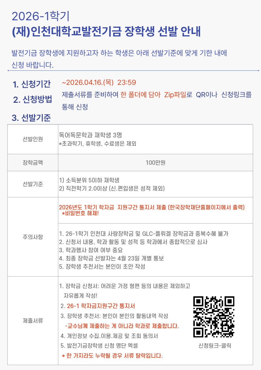 [발전기금] 2026-1학기 (재)인천대학교발전기금 장학생 모집 안내(~2026.04.16. 23:59)