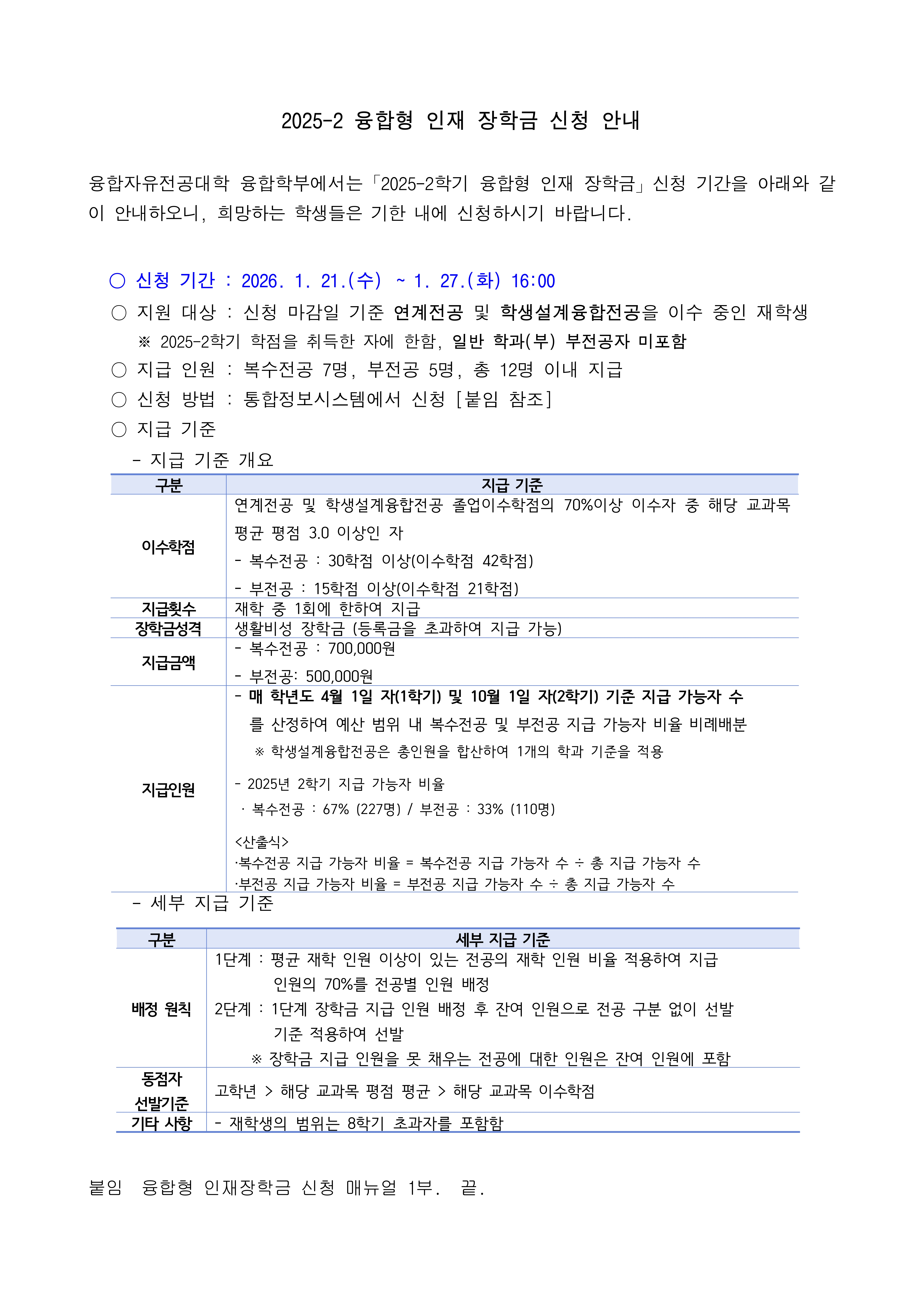 2025-2학기 융합형 인재 장학금 신청 안내(연계전공, 학생설계융합전공 이수자 대상)
