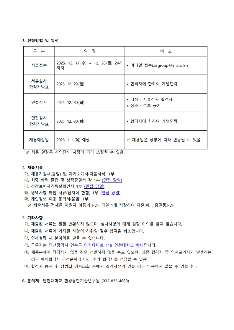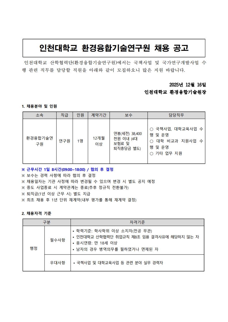 인천대학교 환경융합기술연구원 연구원 채용 공고(~12.28.(일) 24:00까지)