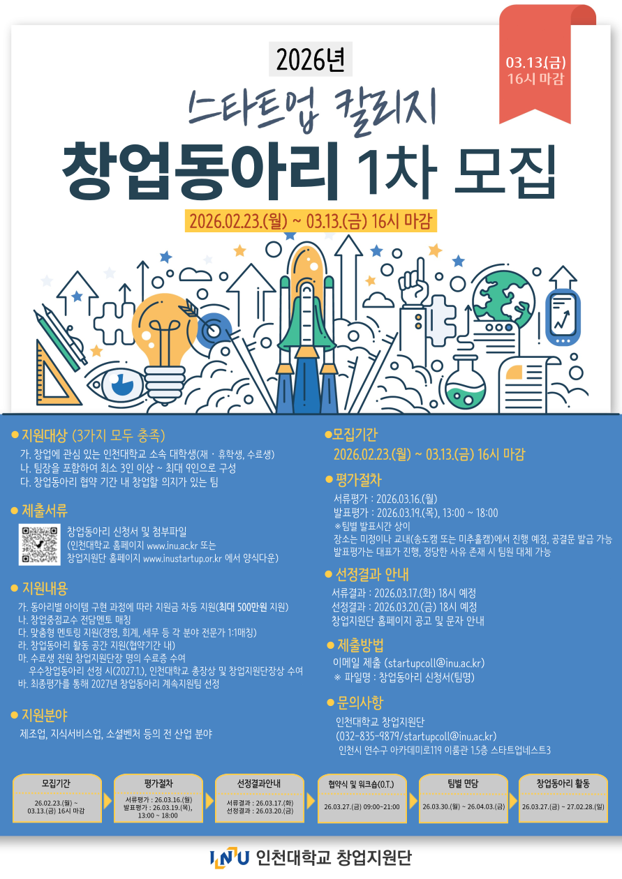 인천대학교 창업지원단은 참신한 아이템을 보유한 창업동아리를 발굴하여 체계적으로 지원하고 창업에 성공할 수 있도록 지원하고자 하오니 많은 참여바랍니다.