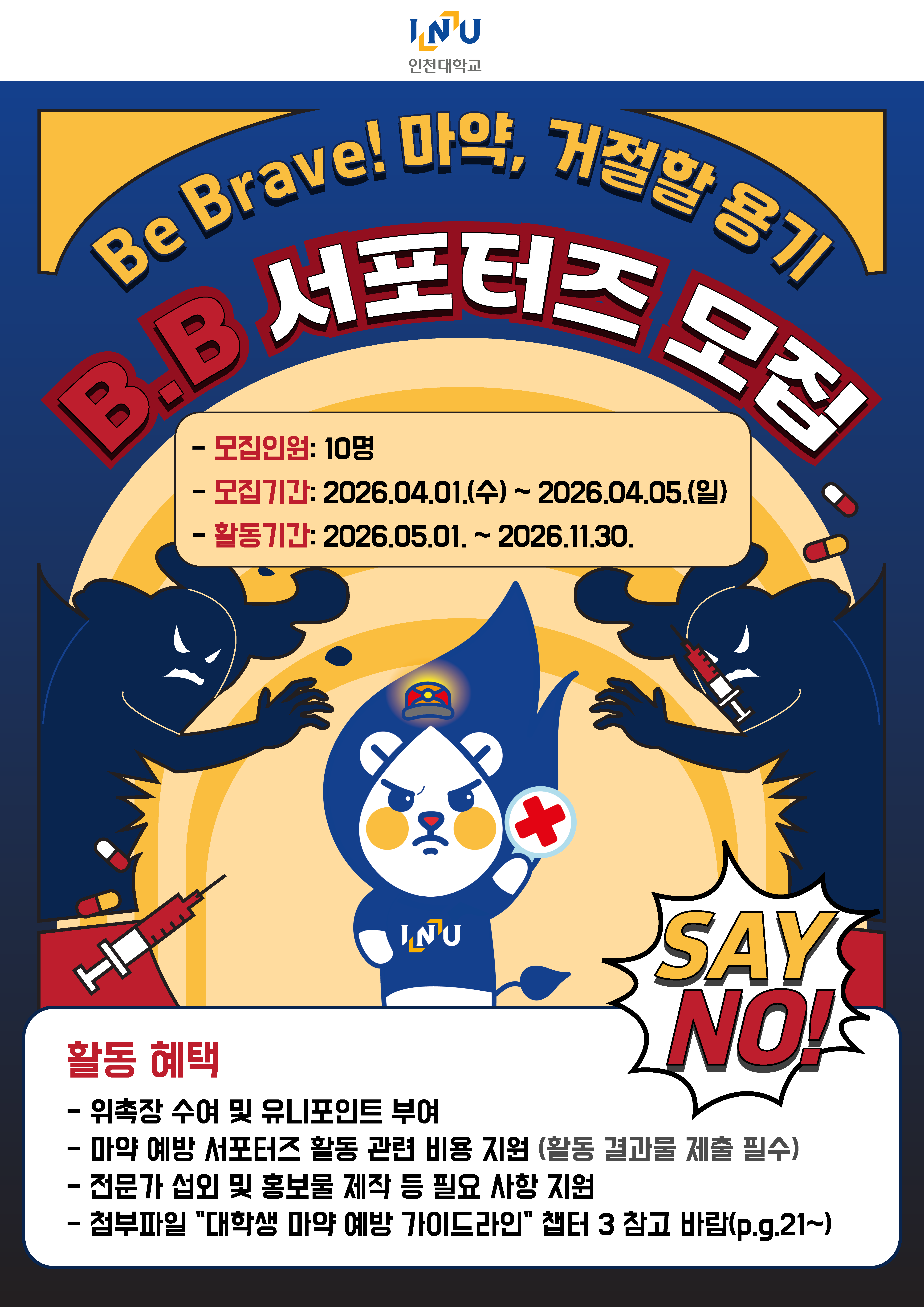 '인천대학교 마약 예방 활동단(INU B.B.서포터즈)'를 모집하고 있사오니 많은 관심 부탁드립니다.