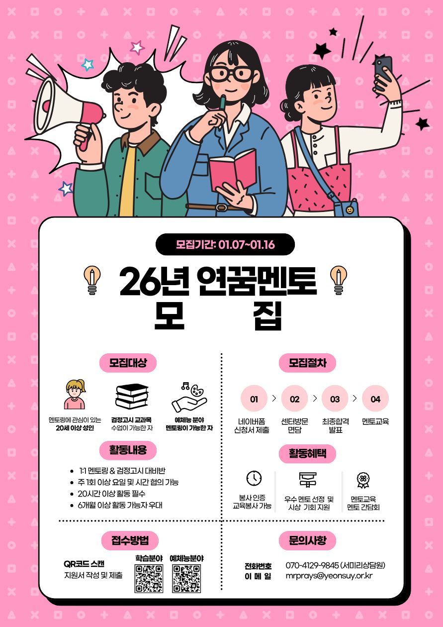 2026년 인천연수구청소년지원센터꿈드림과 함께할 학습&예체능멘토를 모집합니다!