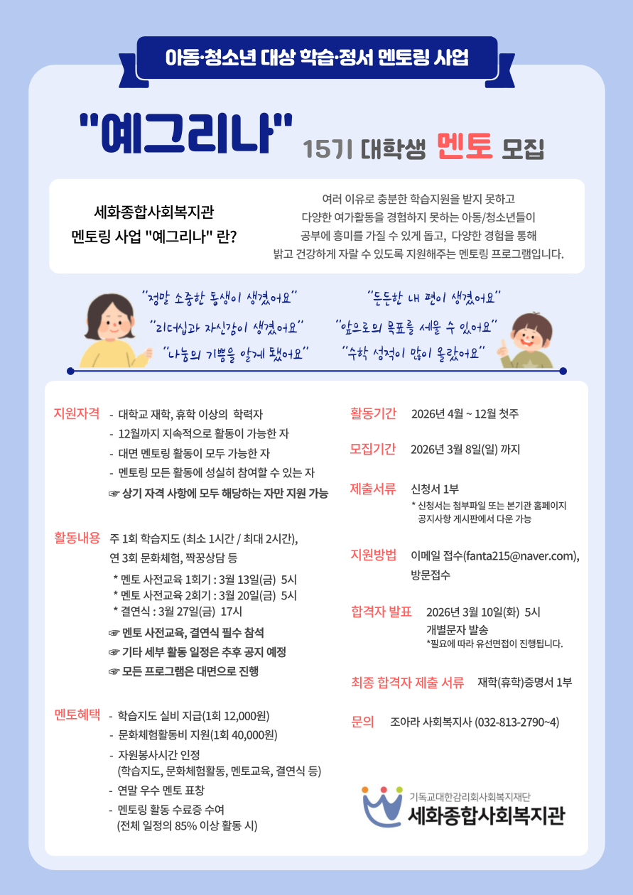 [사회봉사] 세화종합사회복지관 2026년도 멘토링 사업 '예그리나' 대학생 멘토 자원봉사자 모집