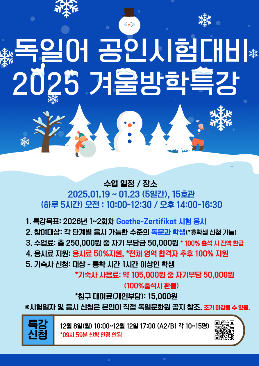 fnctId=bbs,fnctNo=289 [학과특성화사업] 독일어 공인시험대비 2025 겨울방학 특강 신청 안내(2025.12.08.10:00~12.12. 16:00 선착순) 글번호 415840 작성일 2025-12-02 수정일 2025-12-02 작성자 독어독문학과 (032-835-8130) 조회수 687 첨부파일 첨부파일이(가) 없습니다. 다음글 [학사안내] 2025-2학기 RISE 수강학생 할동결과물 및 출석확인서 업로드 안내(~2025.12.19.) 정연서 2025-12-11 11:01:06.0 이전글 [학술공모전] 2025 독어독문학과 학술공모전-최종 발표회 및 학생활동 보고회(2025.11.25.16:00) 정연서 2025-11-21 17:32:49.0 목록