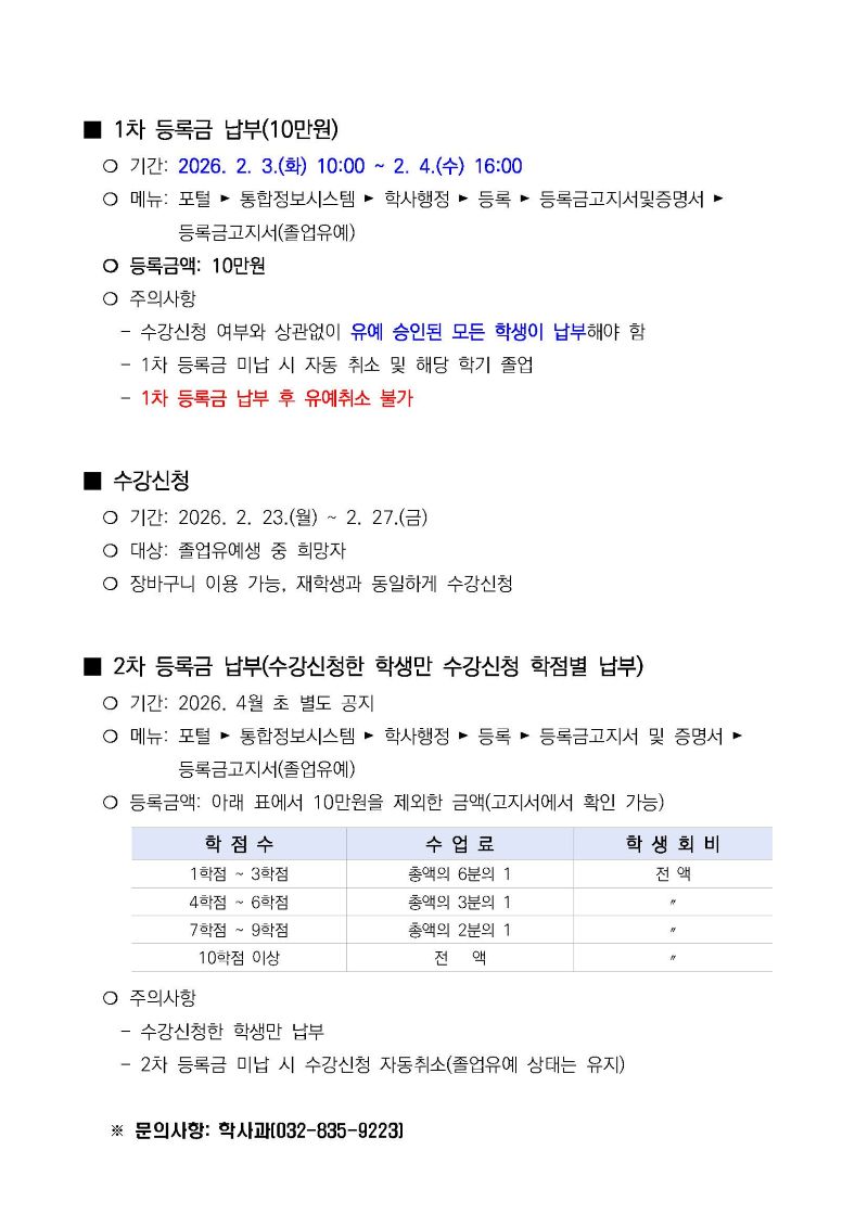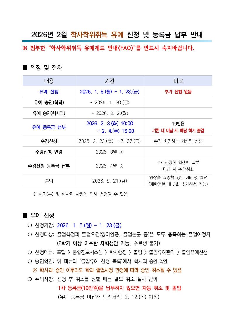 fnctId=bbs,fnctNo=289 [학사안내] 2026년 2월 학사학위취득 유예 신청 및 등록금 납부 안내(2026.01.5.~1.23.) 글번호 416420 작성일 2025-12-15 수정일 2025-12-15 작성자 독어독문학과 (032-835-8130) 조회수 299 첨부파일 [붙임1] 2026년 2월 학사학위취득 유예(졸업유예) 신청 및 등록금 납부 안내.pdf [붙임2] 학사학위취득 유예(졸업유예) 제도 안내(FAQ)_202512.pdf 다음글 [학사안내] 2026-1학기 조기졸업 희망자 신청 안내(2026.1.19~2.20.) 정연서 2025-12-15 13:22:14.0 이전글 [정보기술대학] 정보기술대학 AI 비교과 두 번째 레슨 플랫폼 전문기업 몬드리안 AI와 함께하는 AI 비교과 특강 정연서 2025-12-11 11:12:59.0 목록