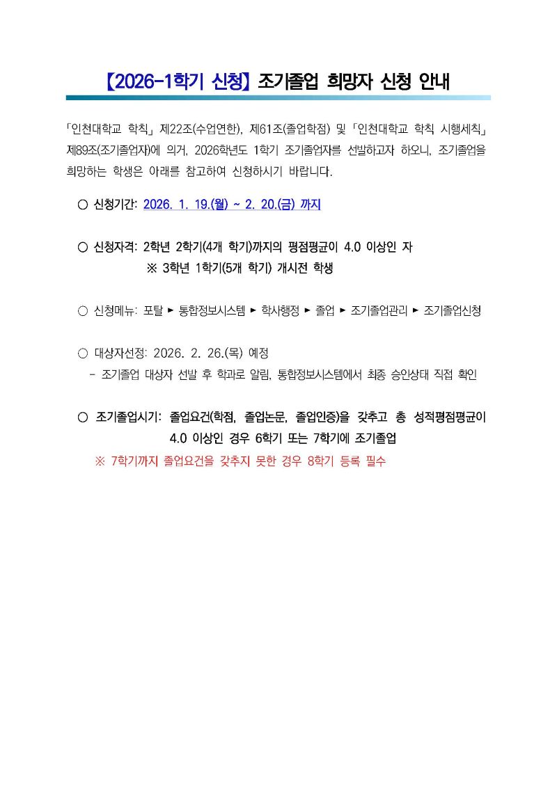fnctId=bbs,fnctNo=289 [학사안내] 2026-1학기 조기졸업 희망자 신청 안내(2026.1.19~2.20.) 글번호 416422 작성일 2025-12-15 수정일 2025-12-15 작성자 독어독문학과 (032-835-8130) 조회수 302 첨부파일 첨부파일이(가) 없습니다. 다음글 [학사안내] 2025 겨울 방학 중 학교 및 학과 사무실 업무 시간 안내 정연서 2025-12-18 18:41:34.0 이전글 [학사안내] 2026년 2월 학사학위취득 유예 신청 및 등록금 납부 안내(2026.01.5.~1.23.) 정연서 2025-12-15 13:17:27.0 목록