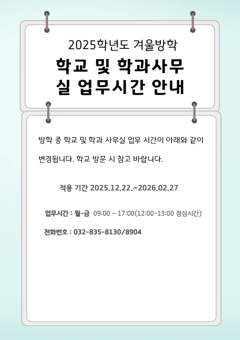fnctId=bbs,fnctNo=289 [학사안내] 2025 겨울 방학 중 학교 및 학과 사무실 업무 시간 안내 글번호 416644 작성일 2025-12-18 수정일 2025-12-18 작성자 독어독문학과 (032-835-8130) 조회수 77 첨부파일 첨부파일이(가) 없습니다. 다음글 이전글 [학사안내] 2026-1학기 조기졸업 희망자 신청 안내(2026.1.19~2.20.) 정연서 2025-12-15 13:22:14.0 목록