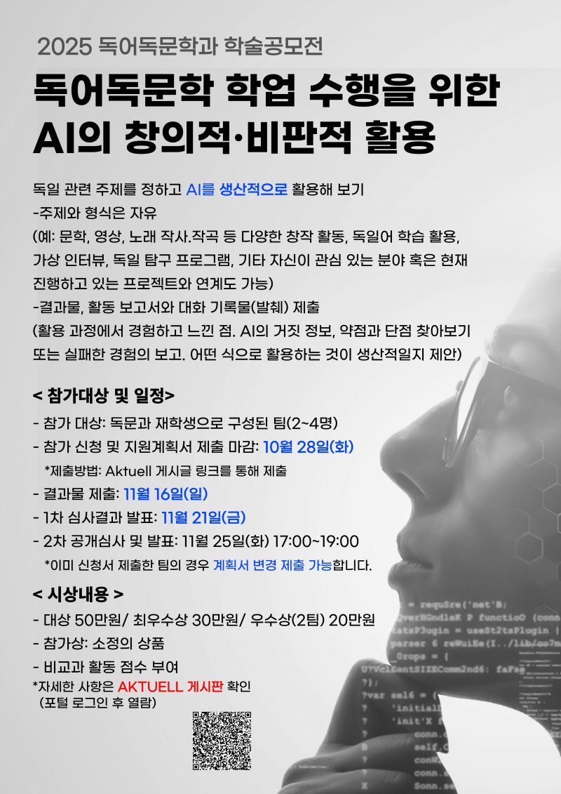 fnctId=bbs,fnctNo=289 [학술공모전] 2025 독어독문학과 학술공모전-'독어독문학 학업 수행을 위한 AI의 창의적.비판적 활용'(신청 및 제출 기간 연장) 글번호 412968 작성일 2025-09-23 수정일 2025-10-21 작성자 독어독문학과 (032-835-8130) 조회수 1117 첨부파일 첨부파일이(가) 없습니다. 다음글 [단과대학 저학년 진로역량 프로그램] 전문가 특강 - <우아한 루저의 나라>에 등장한 독일인 3인 (2025.09.30(화) 15:00~) 정연서 2025-09-24 09:41:10.0 이전글 [INU그레이트북스센터] 비경쟁 토의 그레이트북스 스튜디오 세미나-응답하라2025 함께 사는 공동체 삶 정연서 2025-09-22 16:15:54.0 목록