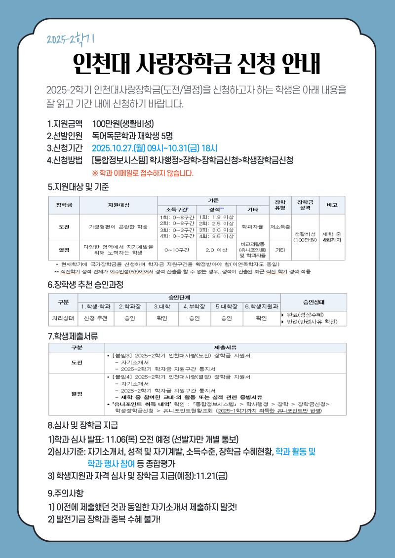 fnctId=bbs,fnctNo=289 [교내장학금] 2025-2학기 인천대 사랑장학금(도전/열정) 신청 안내(2025.10.27.(월) 9:00~10.31.(금) 18:00) 글번호 413979 작성일 2025-10-20 수정일 2025-10-20 작성자 독어독문학과 (032-835-8130) 조회수 286 첨부파일 (붙임3) 2025-2학기 인천대사랑(도전) 장학금 지원서 서식.hwp (붙임4) 2025-2학기 인천대사랑(열정) 장학금 지원서 서식.hwp 다음글 [발전기금] 2025-2학기 발전기금 장학금 신청 안내(~2025.11. 정연서 2025-10-21 16:25:09.0 이전글 [학과특성화사업]2025 취업관련자격증 취득 지원(3차)(~2025.10.30. 09:00) 정연서 2025-10-17 15:54:01.0 목록