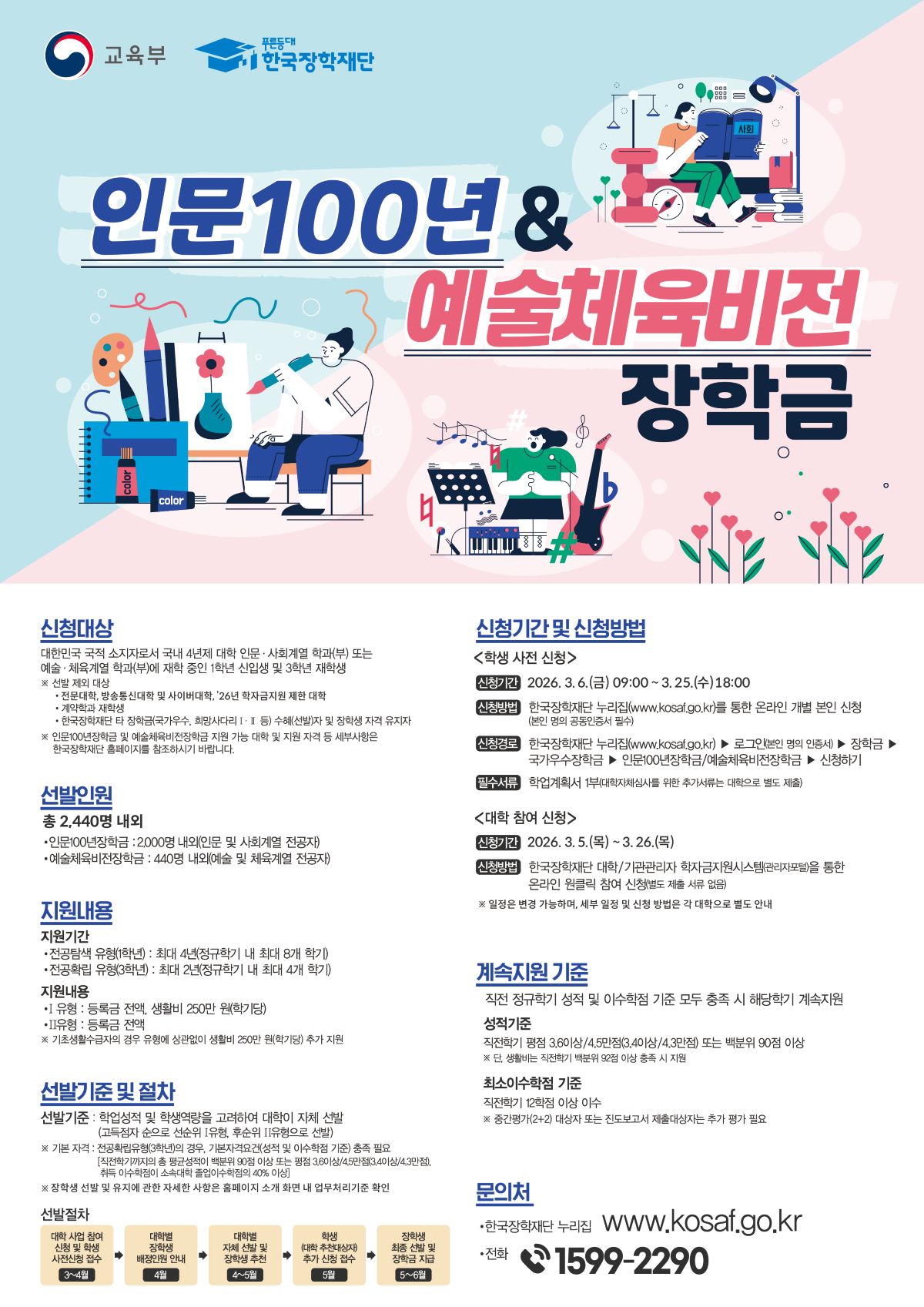 [한국장학재단] 인문100년&예술체육비전 장학금 사전 신청 안내 (~3.25(수) 18:00)