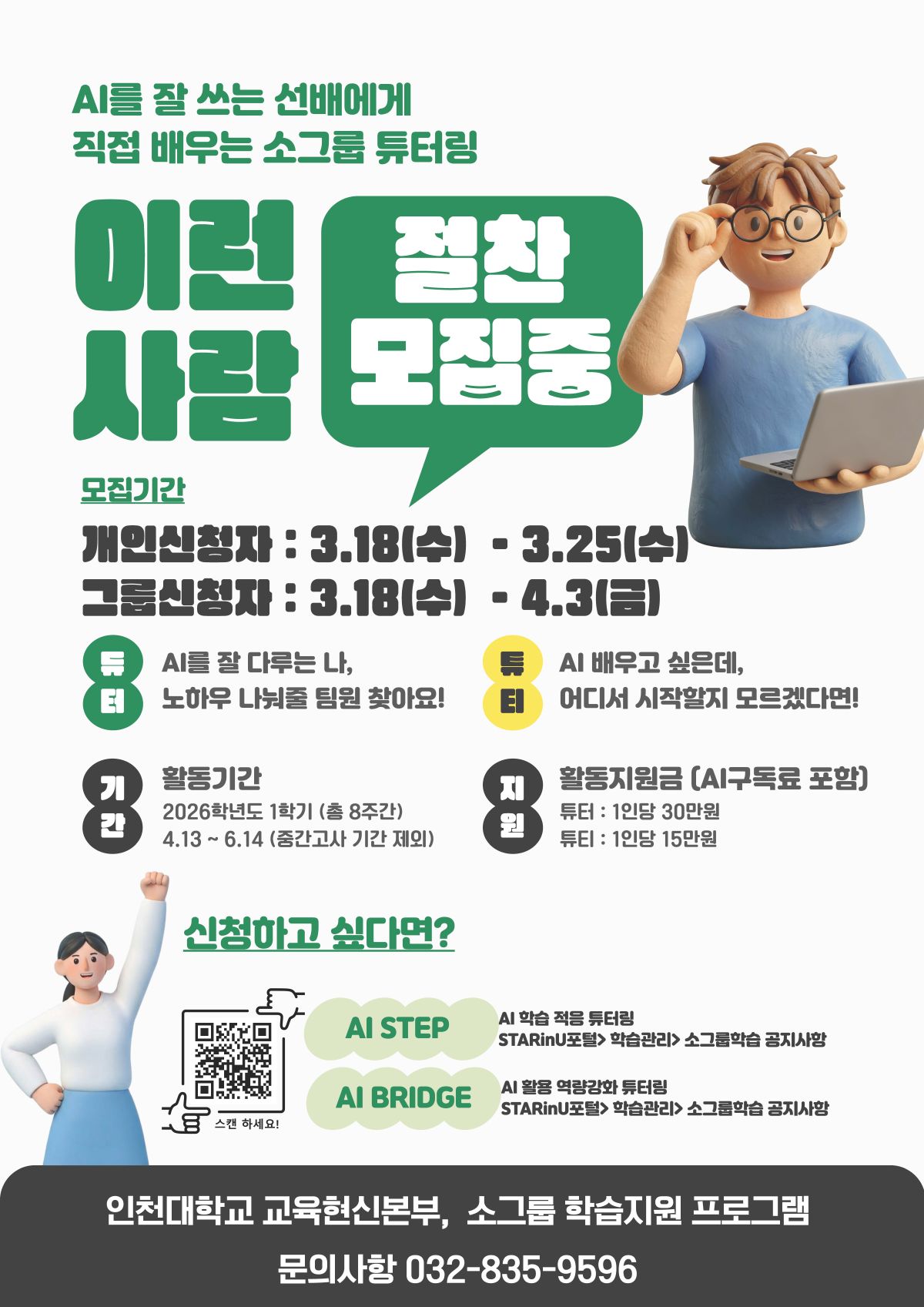 fnctId=bbs,fnctNo=289 [교육혁신본부 교육혁신과] 26-1학기 소그룹 학습지원 프로그램 신청 안내 글번호 421396 작성일 2026-03-19 수정일 2026-03-19 작성자 독어독문학과 (032-835-8130) 조회수 175 첨부파일 2026-1학기 소그룹 학습지원 프로그램 모집안내.pdf 다음글 [ 학과특성화사업] 2026학년도 전공 스터디그룹 지원신청 안내(마감) 정연서 2026-03-20 11:27:46.0 이전글 [교육혁신본부] 2026-1학기 학부생 학회발표 지원 프로그램 안내(2026. 4. 1. 00:00~ 8. 31.) 예산소진시까지 정연서 2026-03-17 11:59:30.0 목록