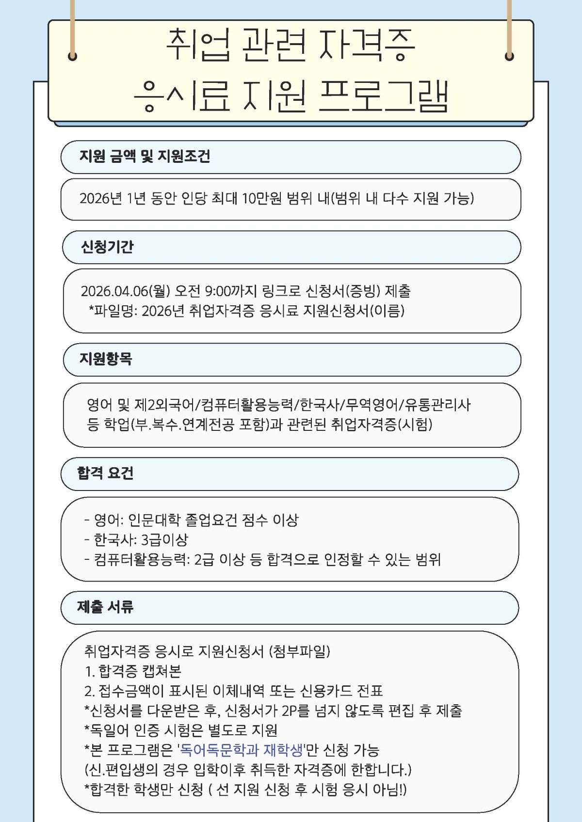fnctId=bbs,fnctNo=289 [학과특성화사업] 2026 취업 관련 자격증 응시료 지원(1차) 신청 안내(~2026.04.06, 09:00) 글번호 421467 작성일 2026-03-20 수정일 2026-03-23 작성자 독어독문학과 (032-835-8130) 조회수 143 *포스터 클릭하면 연결됩니다. 첨부파일 2026년 취업자격증 응시료 지원신청서.hwp 다음글 이전글 [학과특성화사업] 2026 독일어 공인 어학 취득 지원(1차) 안내(~2026.04.06. 09:00) 정연서 2026-03-20 13:43:54.0 목록