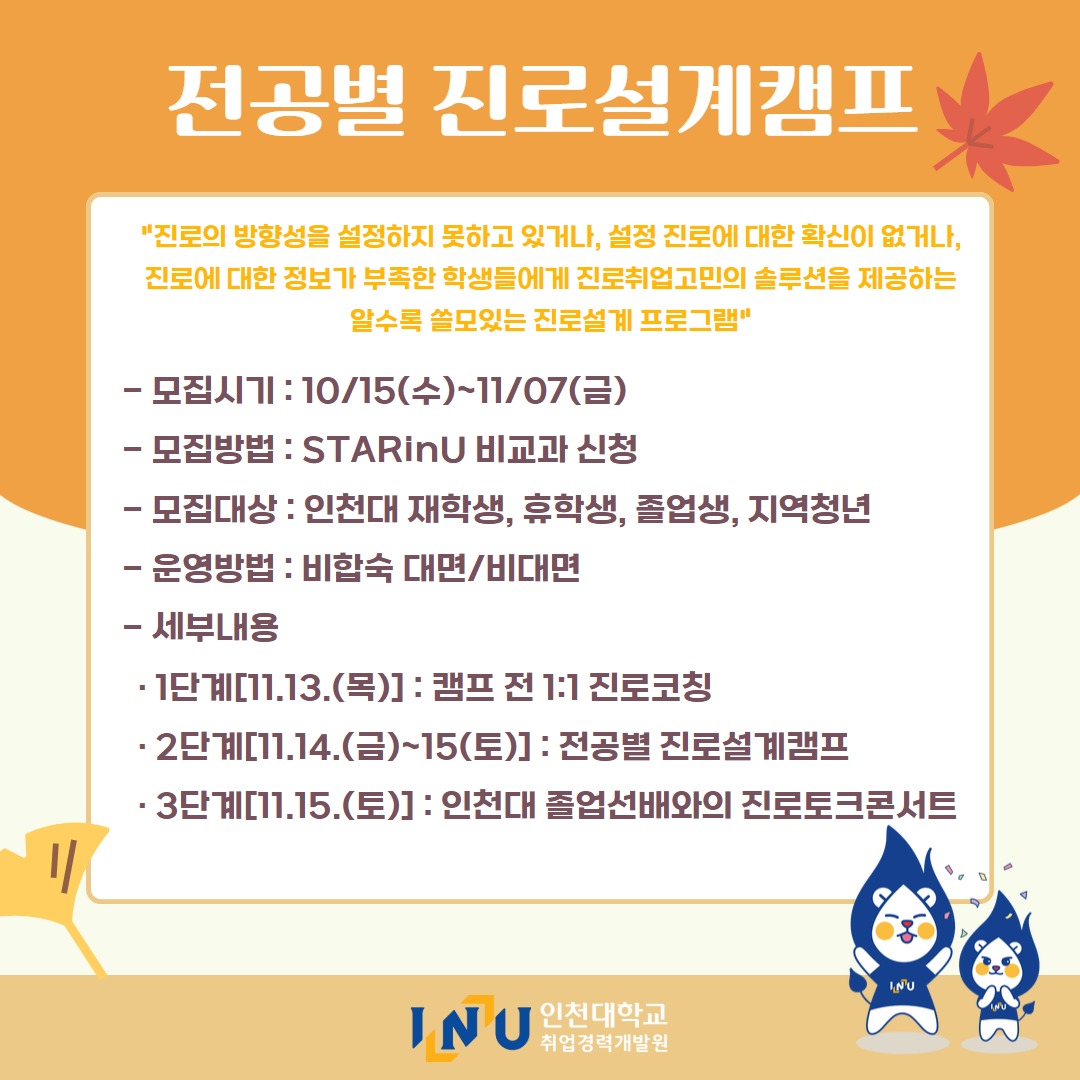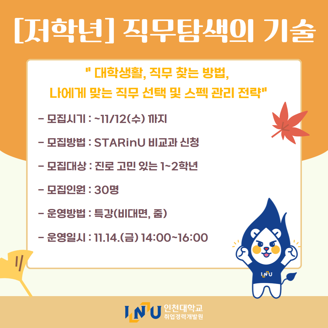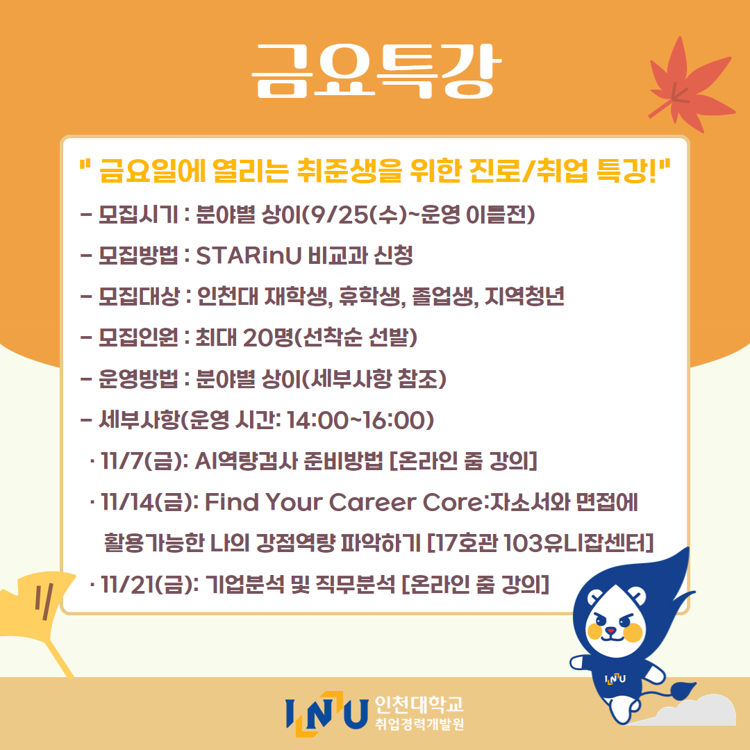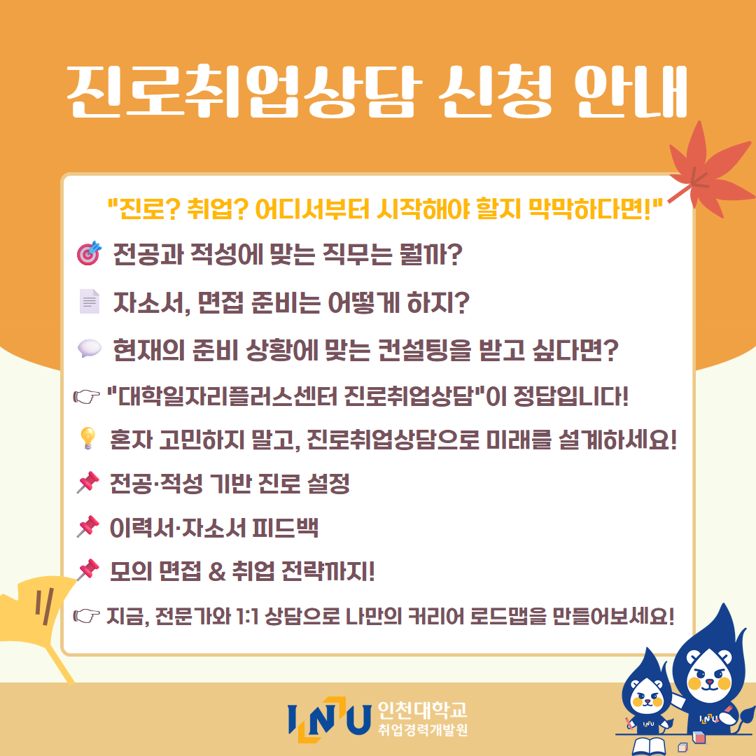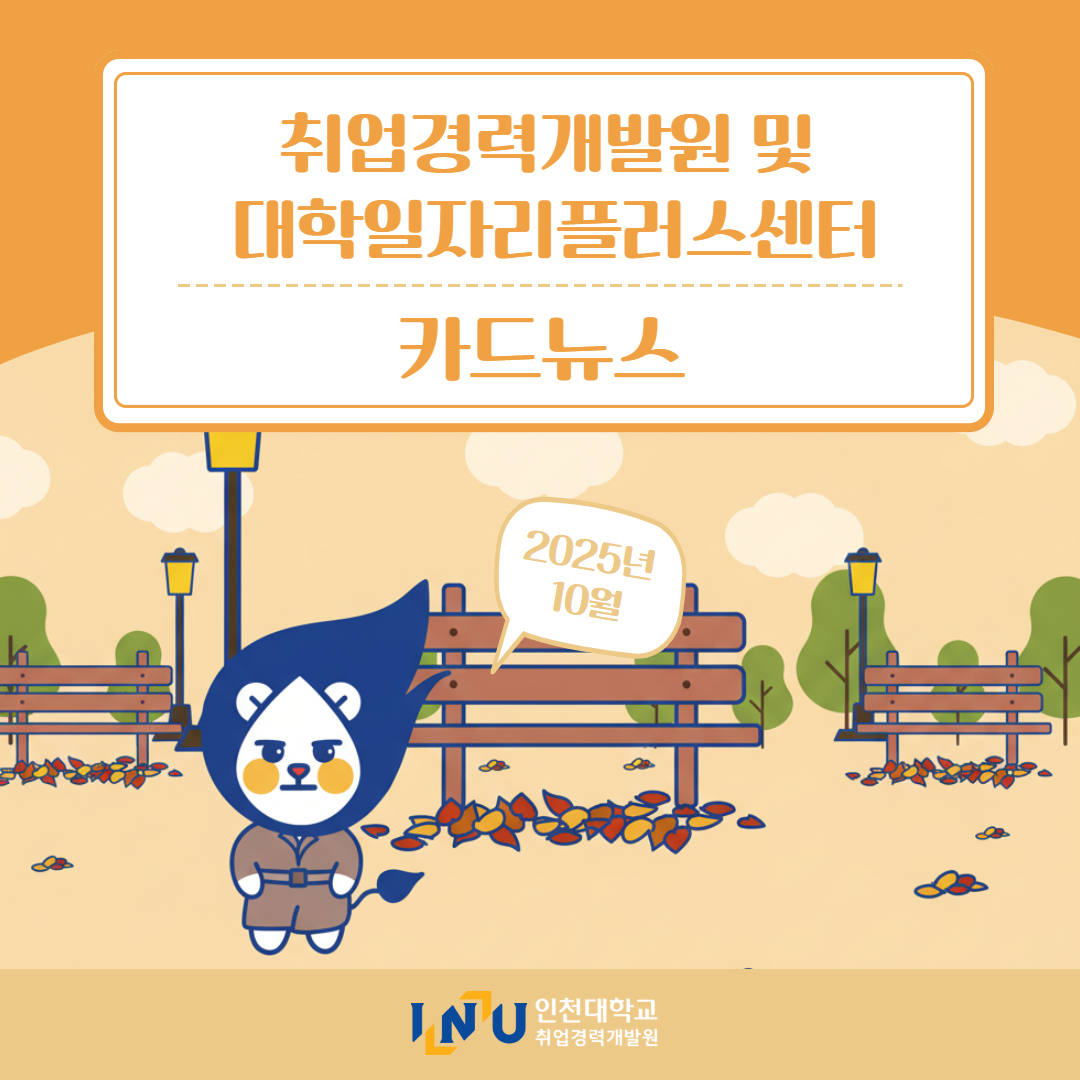 fnctId=bbs,fnctNo=600 [취업경력개발원]10월 카드뉴스 글번호 414594 작성일 2025-11-03 수정일 2025-11-03 작성자 독어독문학과 (032-835-8130) 조회수 323 첨부파일 첨부파일이(가) 없습니다. 다음글 [취업경력개발팀/대학일자리플러스] INU청년 취업박람회 안내 정연서 2025-11-05 11:42:28.0 이전글 [취업경력개발원/대학일자리플러스센터] 11월 프로그램 정연서 2025-11-03 10:51:57.0 목록
