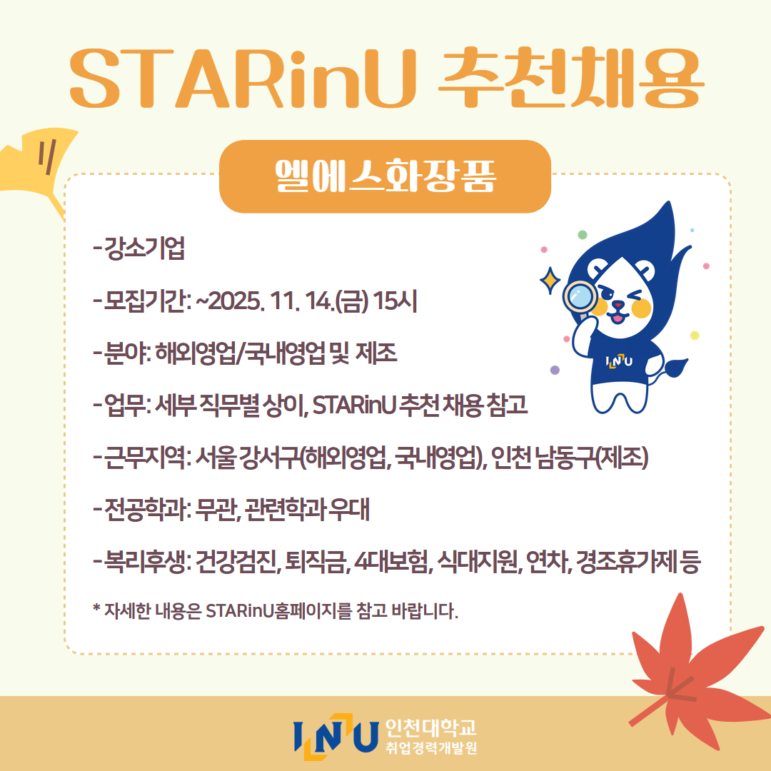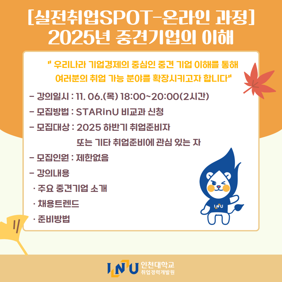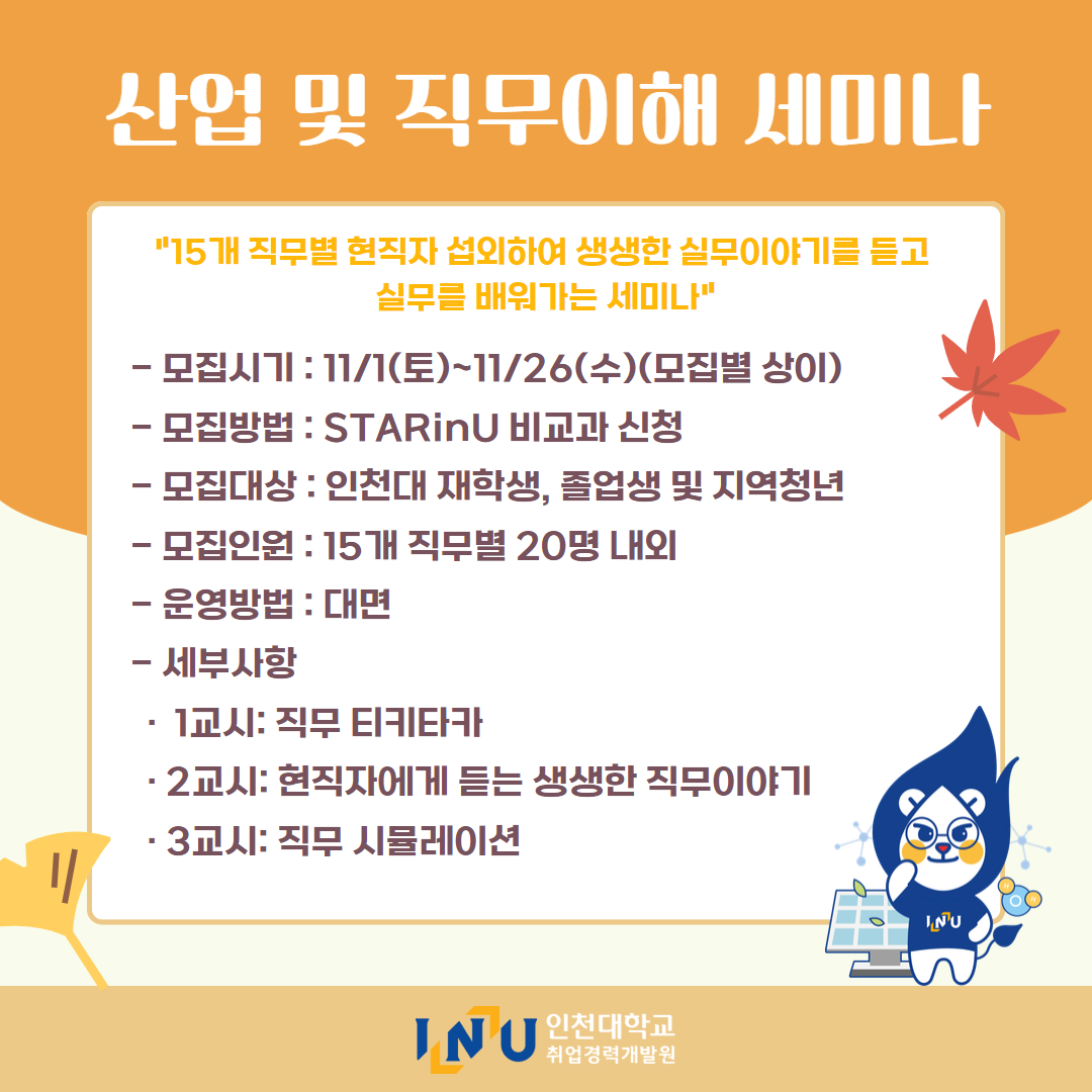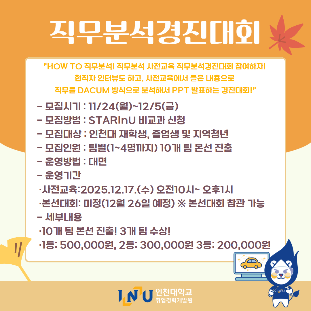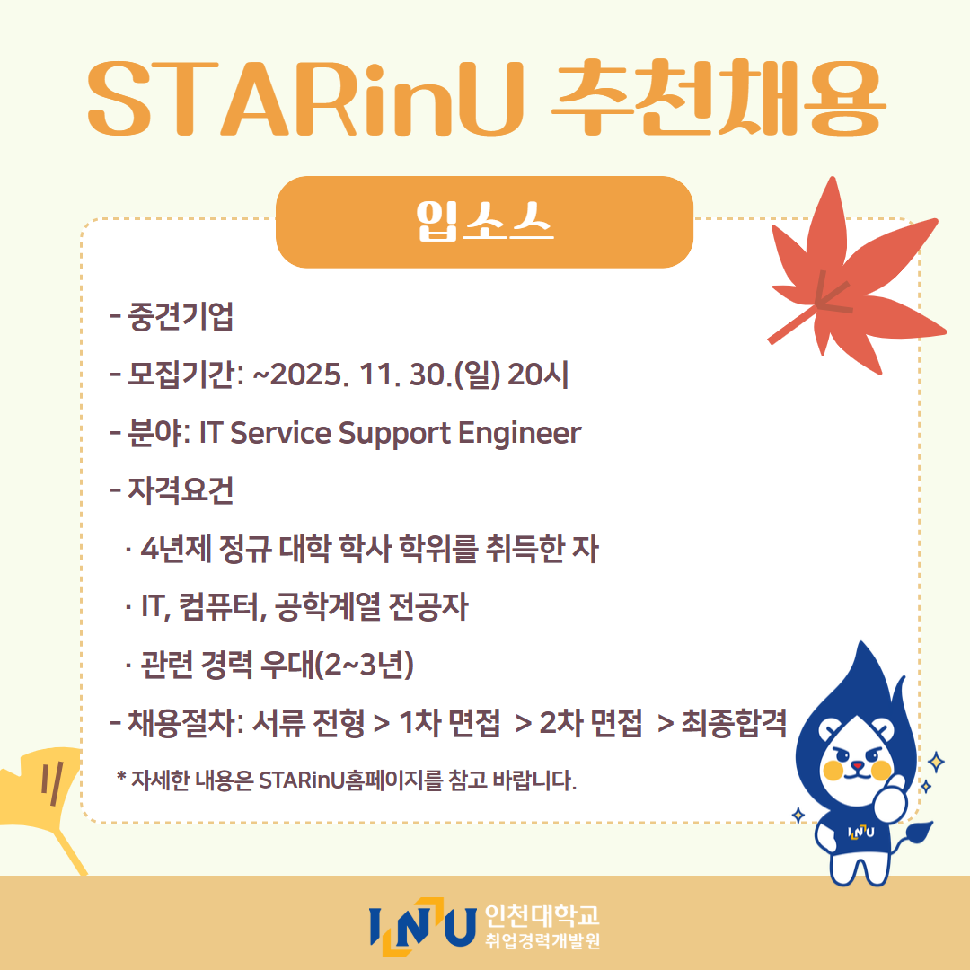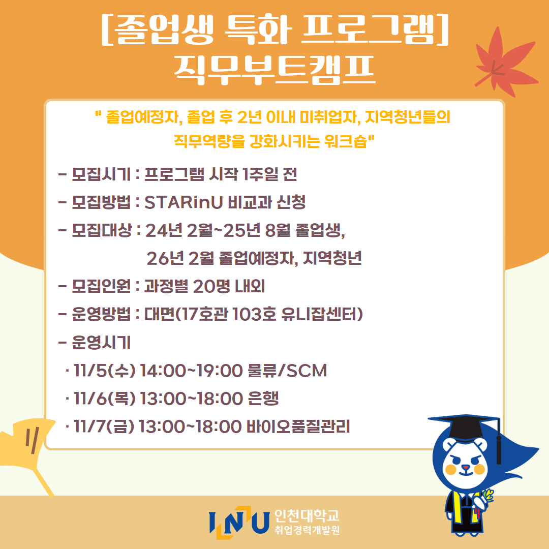 fnctId=bbs,fnctNo=600 [취업경력개발원]10월 카드뉴스 글번호 414594 작성일 2025-11-03 수정일 2025-11-03 작성자 독어독문학과 (032-835-8130) 조회수 323 첨부파일 첨부파일이(가) 없습니다. 다음글 [취업경력개발팀/대학일자리플러스] INU청년 취업박람회 안내 정연서 2025-11-05 11:42:28.0 이전글 [취업경력개발원/대학일자리플러스센터] 11월 프로그램 정연서 2025-11-03 10:51:57.0 목록