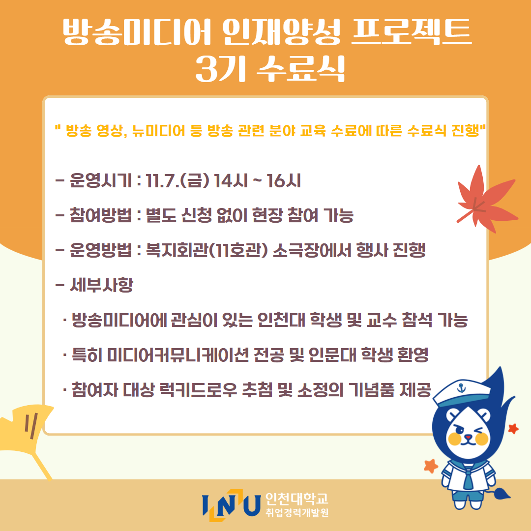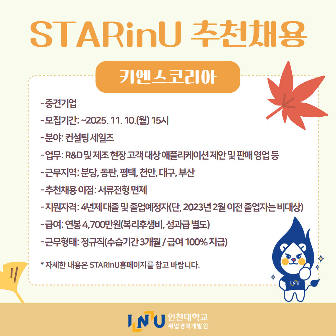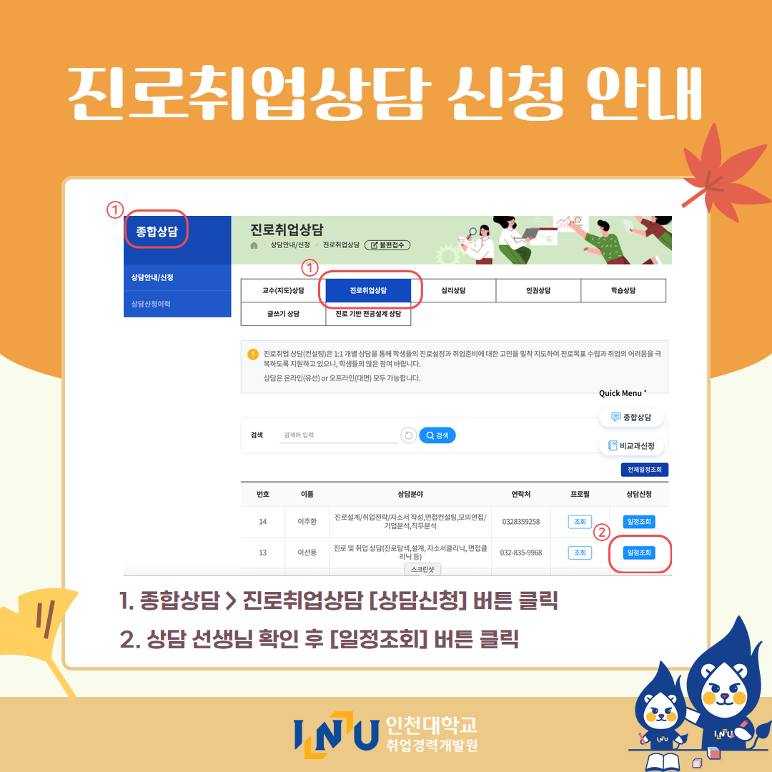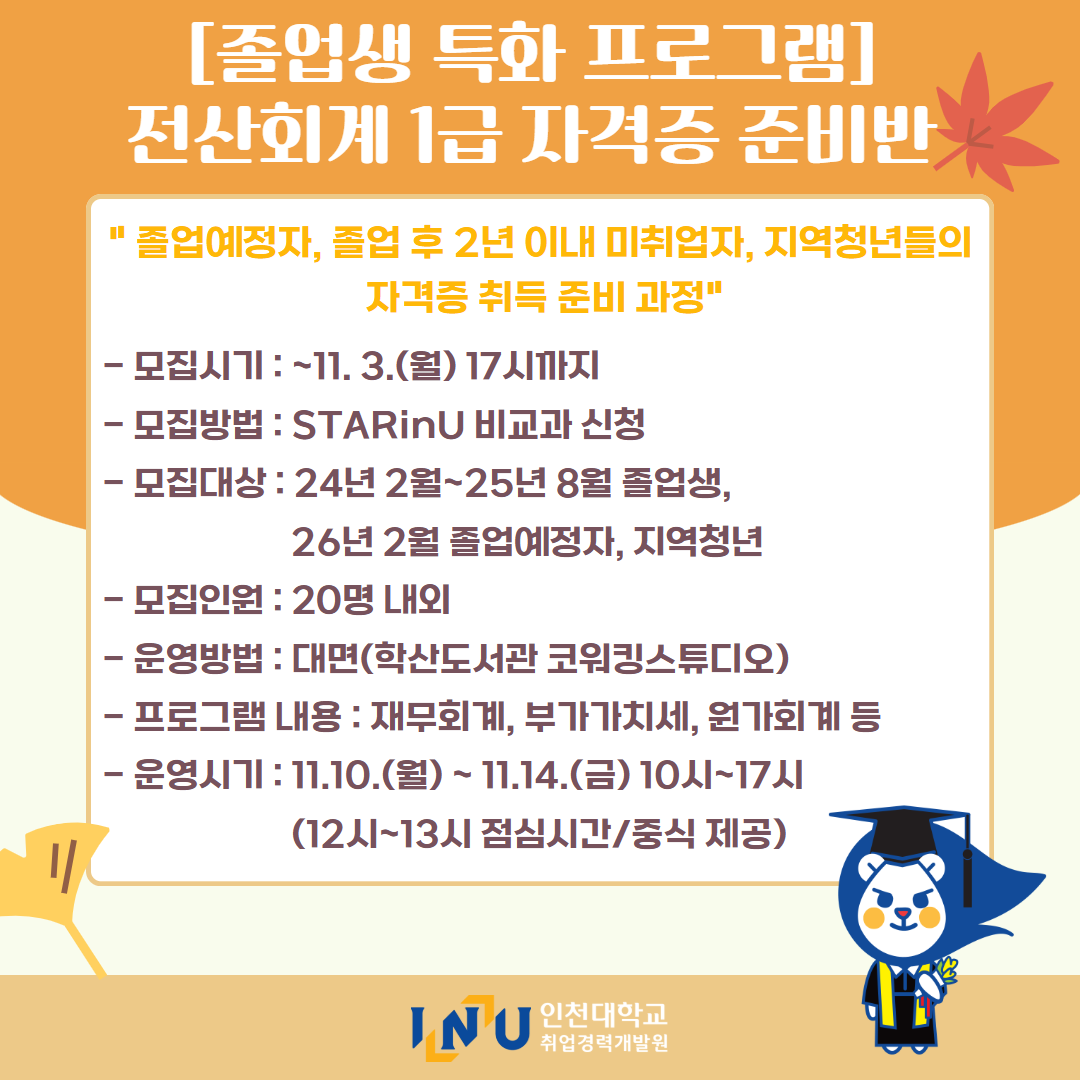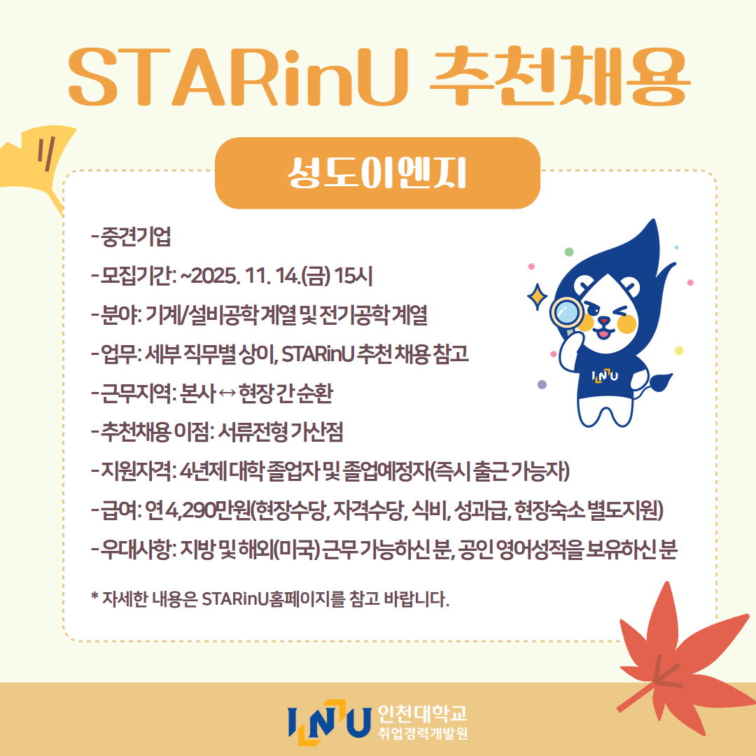 fnctId=bbs,fnctNo=600 [취업경력개발원]10월 카드뉴스 글번호 414594 작성일 2025-11-03 수정일 2025-11-03 작성자 독어독문학과 (032-835-8130) 조회수 323 첨부파일 첨부파일이(가) 없습니다. 다음글 [취업경력개발팀/대학일자리플러스] INU청년 취업박람회 안내 정연서 2025-11-05 11:42:28.0 이전글 [취업경력개발원/대학일자리플러스센터] 11월 프로그램 정연서 2025-11-03 10:51:57.0 목록