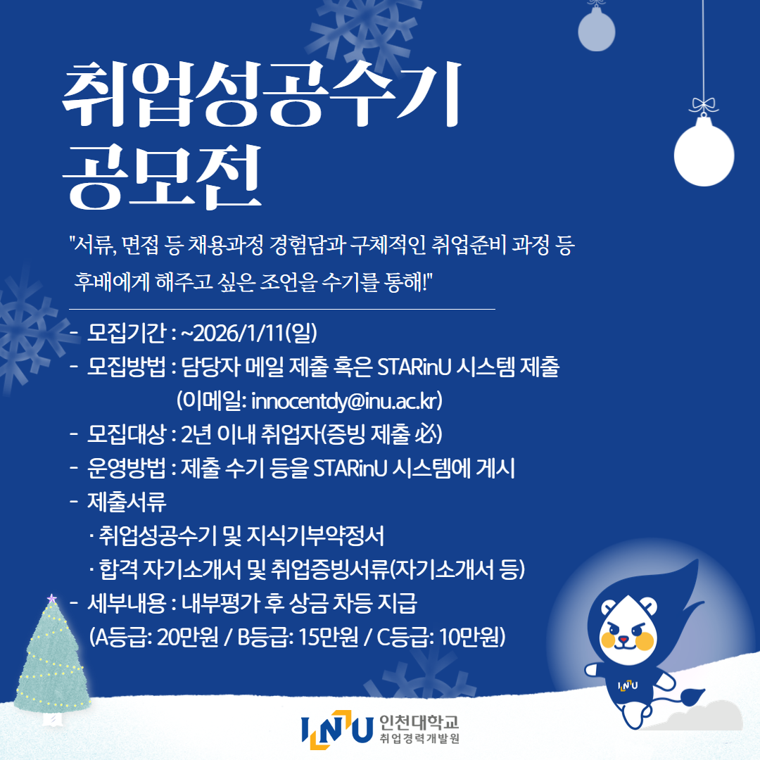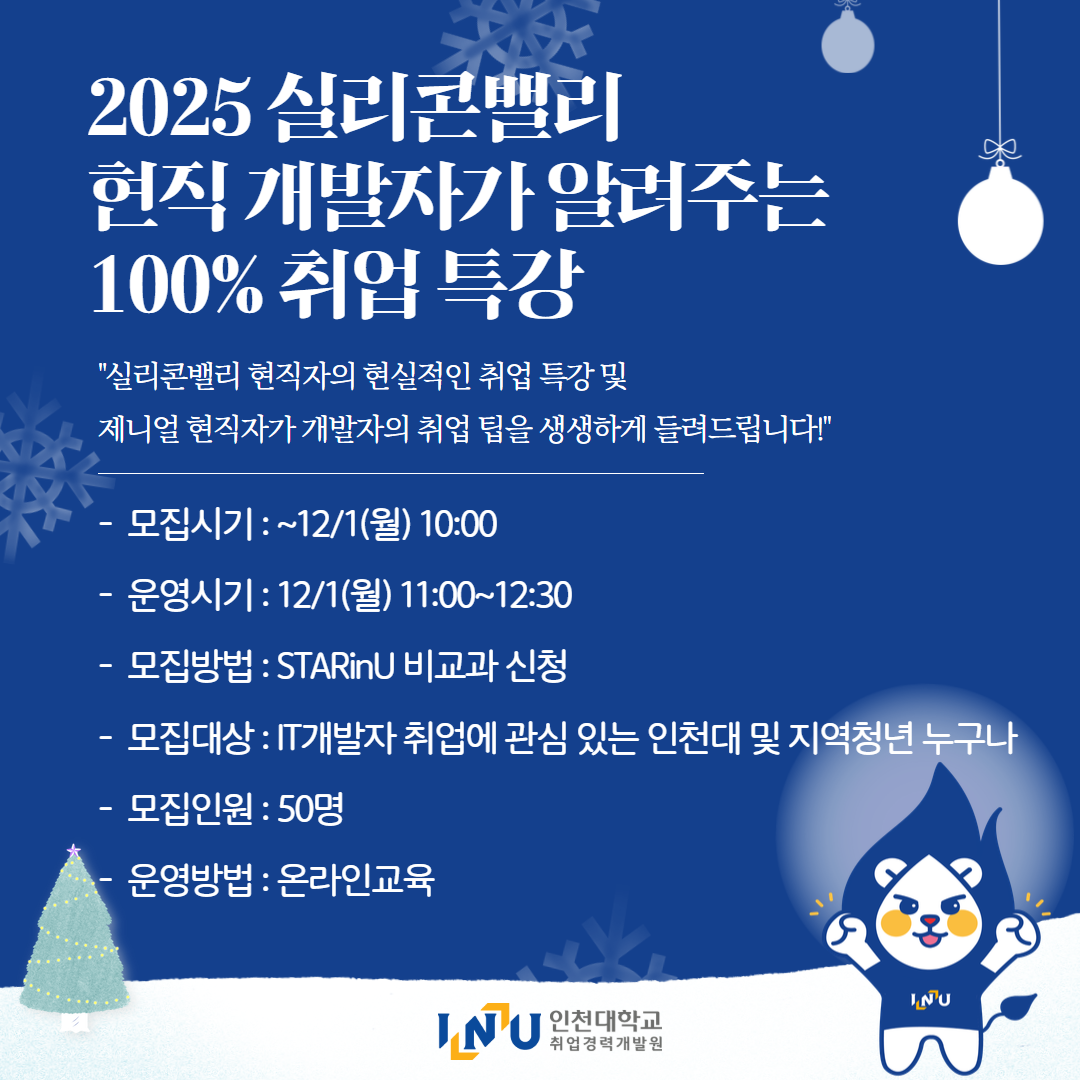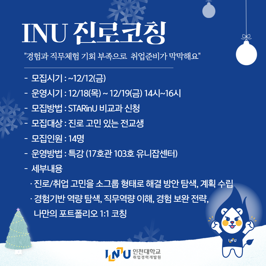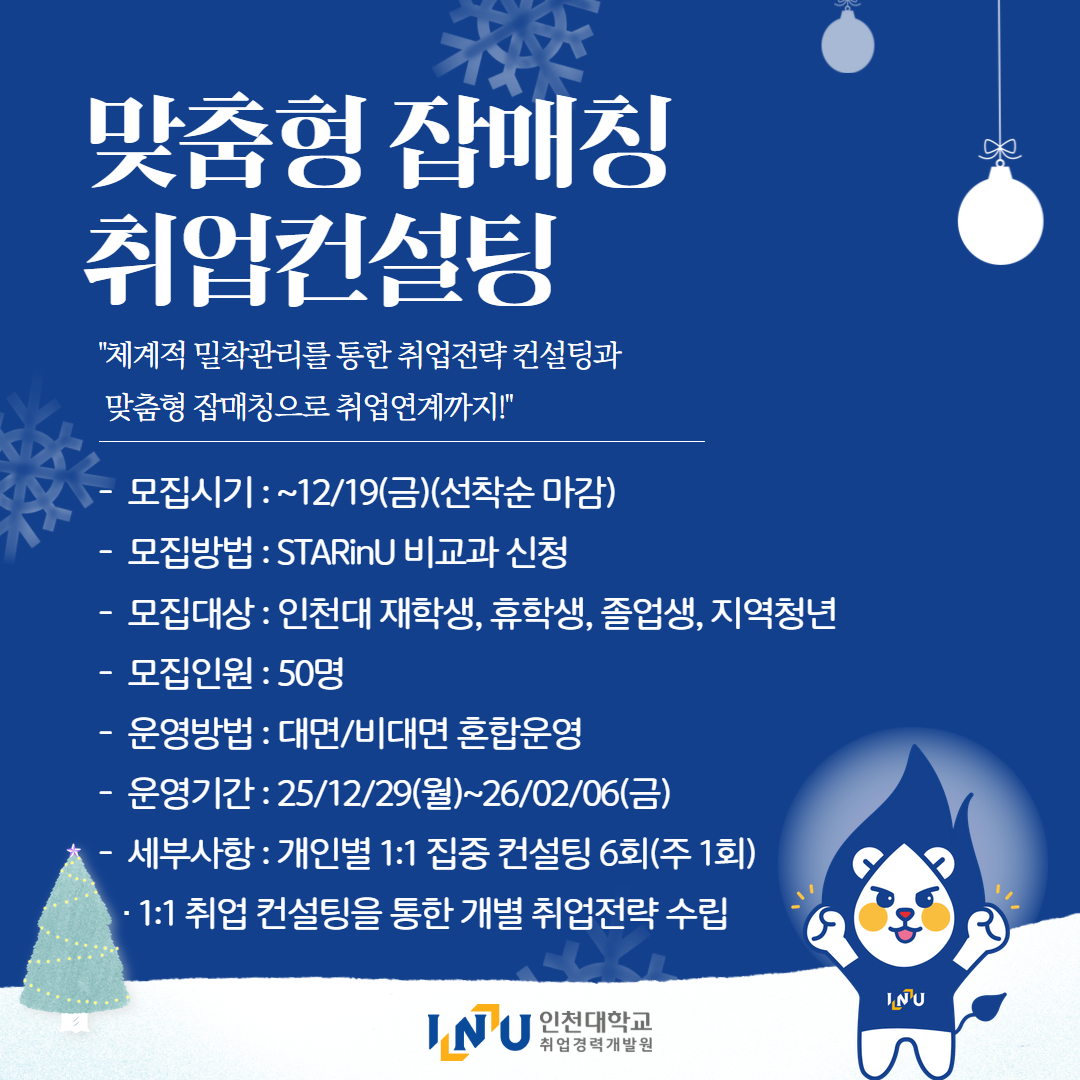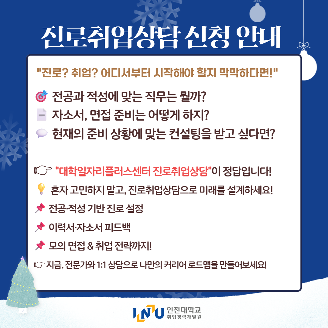 fnctId=bbs,fnctNo=600 [취업경력개발원/대학일자리플러스]11월 카드뉴스 글번호 415705 작성일 2025-11-28 수정일 2025-11-28 작성자 독어독문학과 (032-835-8130) 조회수 545 첨부파일 첨부파일이(가) 없습니다. 다음글 이전글 [취업경력개발원/대학일자리플러스센터] 12월 프로그램 정연서 2025-11-28 13:06:31.0 목록