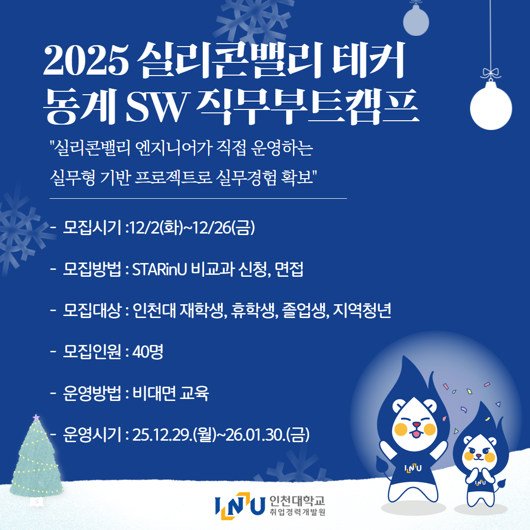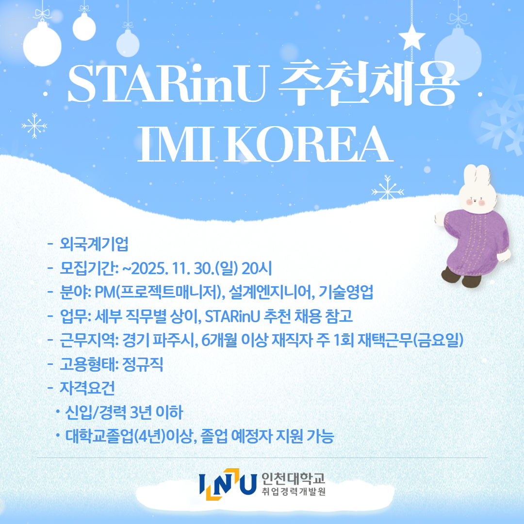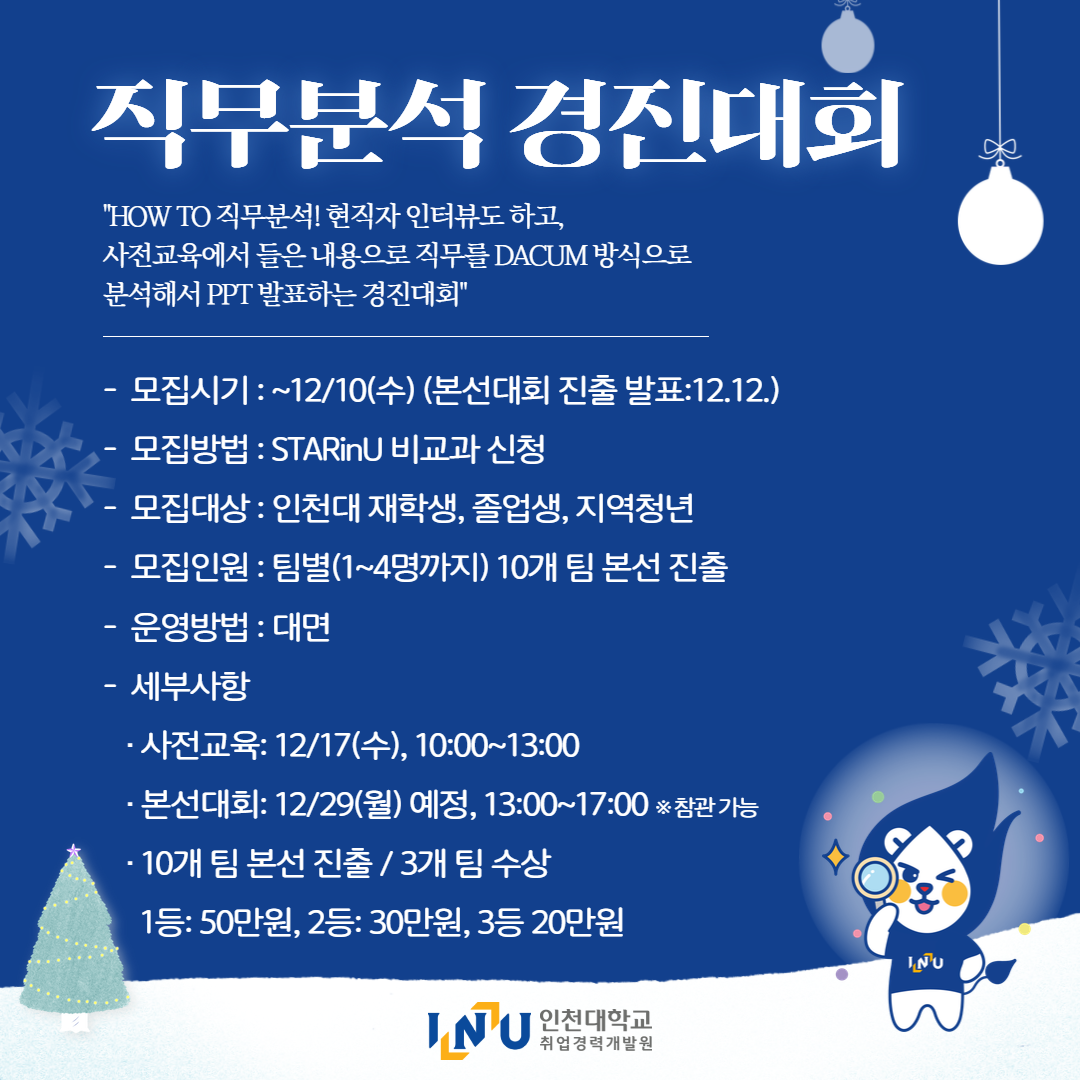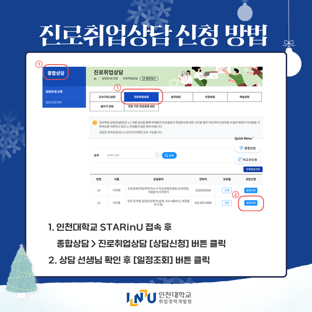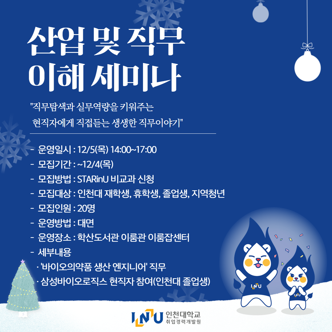 fnctId=bbs,fnctNo=600 [취업경력개발원/대학일자리플러스]11월 카드뉴스 글번호 415705 작성일 2025-11-28 수정일 2025-11-28 작성자 독어독문학과 (032-835-8130) 조회수 545 첨부파일 첨부파일이(가) 없습니다. 다음글 이전글 [취업경력개발원/대학일자리플러스센터] 12월 프로그램 정연서 2025-11-28 13:06:31.0 목록