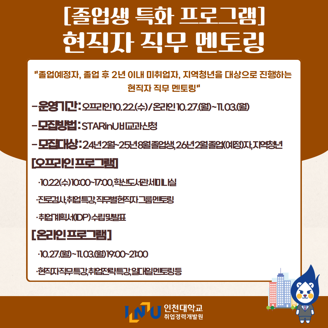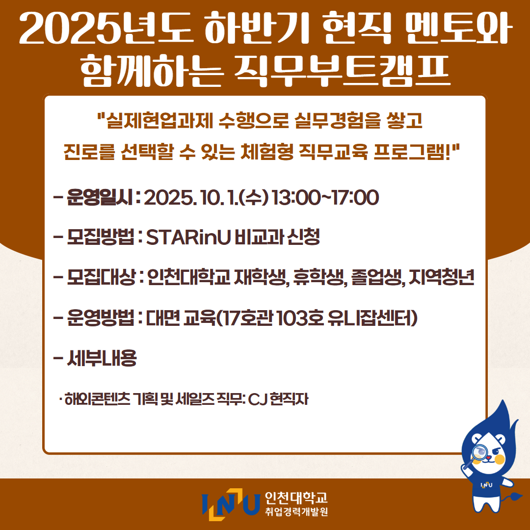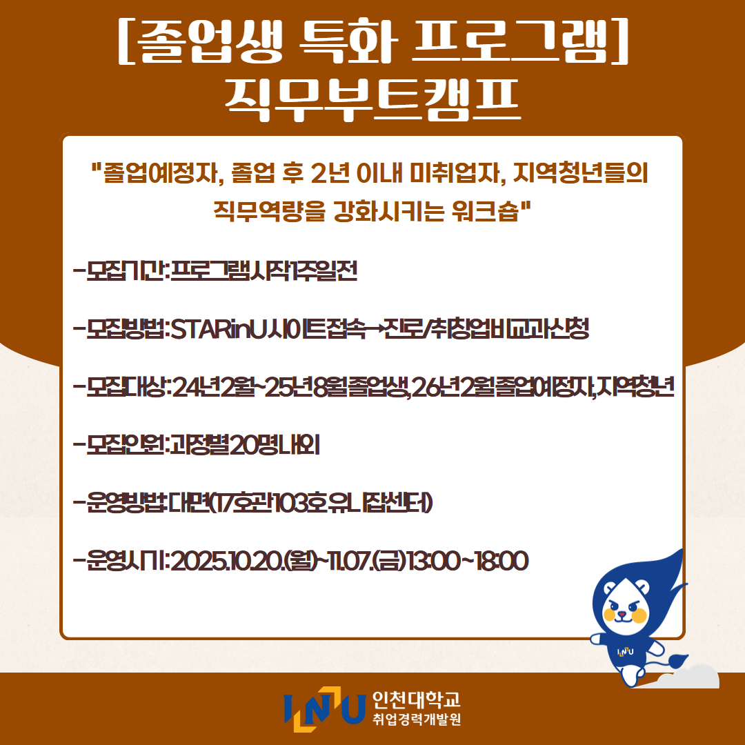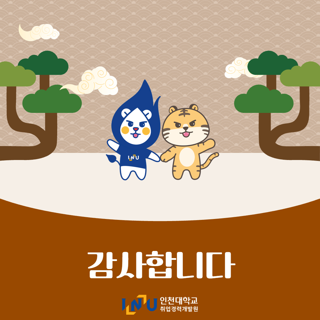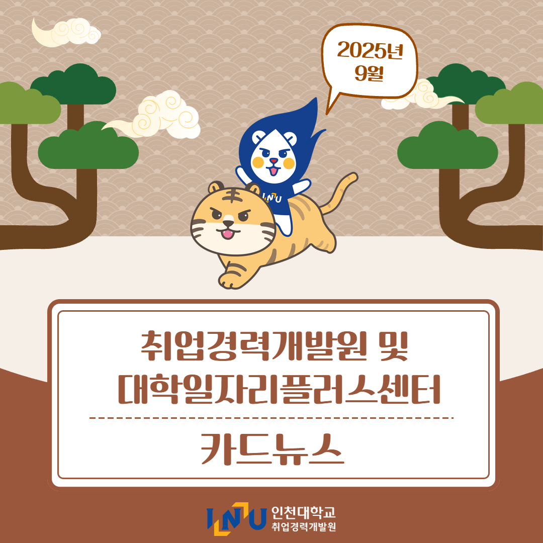 fnctId=bbs,fnctNo=600 [취업경력개발팀/대학일자리플러스] 9월 카드뉴스 글번호 413313 작성일 2025-09-30 수정일 2025-09-30 작성자 독어독문학과 (032-835-8130) 조회수 561 첨부파일 첨부파일이(가) 없습니다. 다음글 [대학일자리플러스센터] 인천대학교 2025년 졸업생 특화 오프라인 현직자 직무 멘토링(2025.10.22 10:00~17:00) 정연서 2025-10-10 11:14:01.0 이전글 [취업경력개발원 및 대학일자리플러스센터] 10월 프로그램 정연서 2025-09-30 11:26:57.0 목록