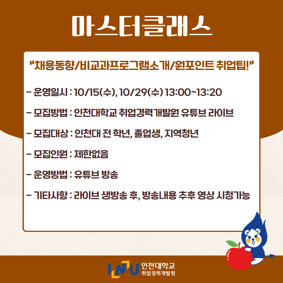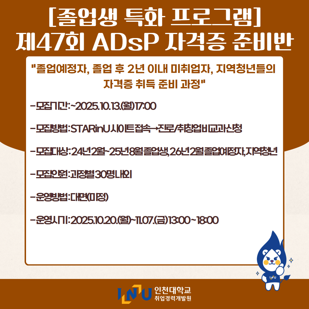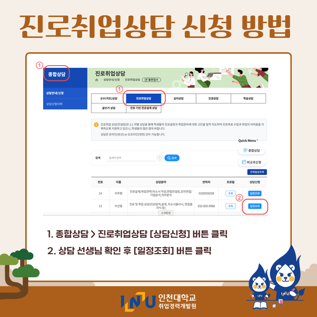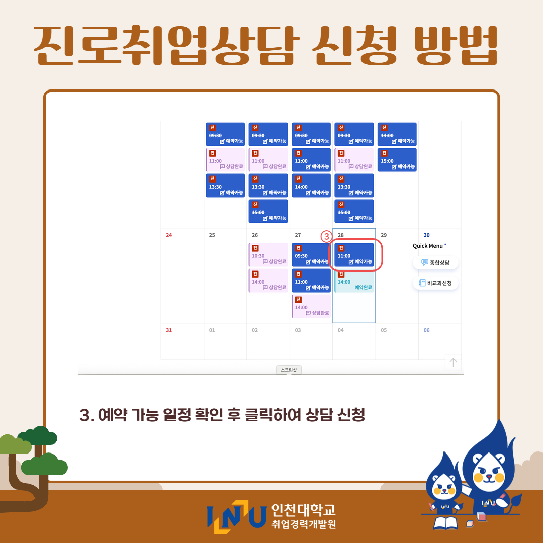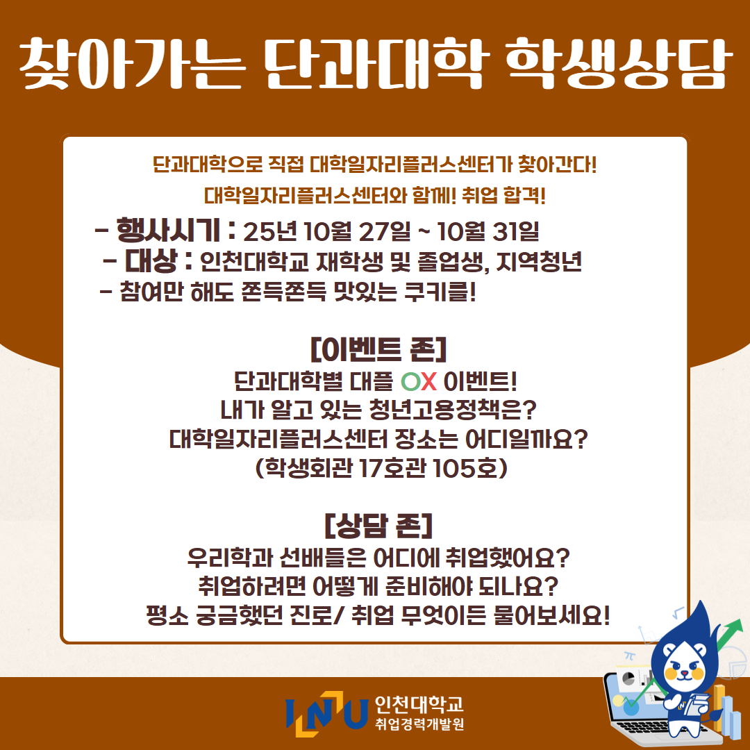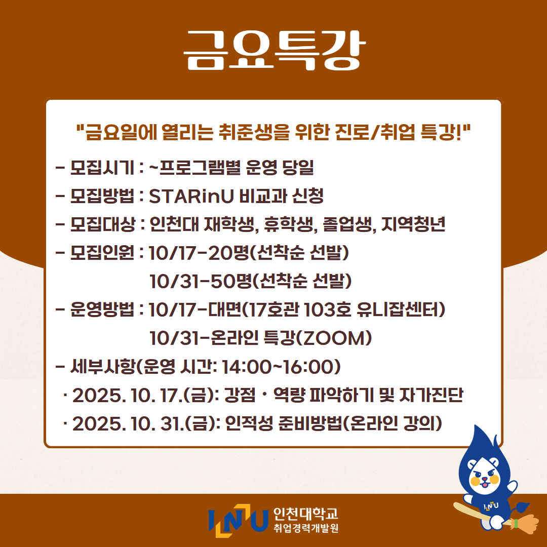 fnctId=bbs,fnctNo=600 [취업경력개발팀/대학일자리플러스] 9월 카드뉴스 글번호 413313 작성일 2025-09-30 수정일 2025-09-30 작성자 독어독문학과 (032-835-8130) 조회수 561 첨부파일 첨부파일이(가) 없습니다. 다음글 [대학일자리플러스센터] 인천대학교 2025년 졸업생 특화 오프라인 현직자 직무 멘토링(2025.10.22 10:00~17:00) 정연서 2025-10-10 11:14:01.0 이전글 [취업경력개발원 및 대학일자리플러스센터] 10월 프로그램 정연서 2025-09-30 11:26:57.0 목록