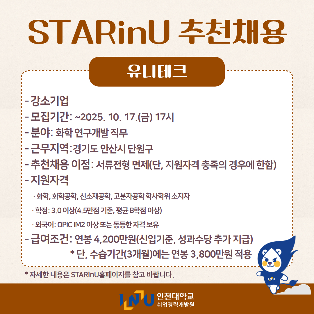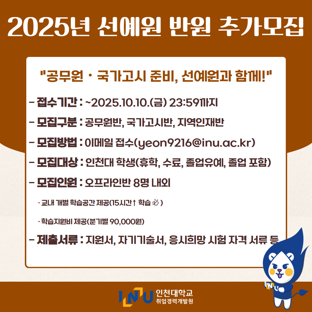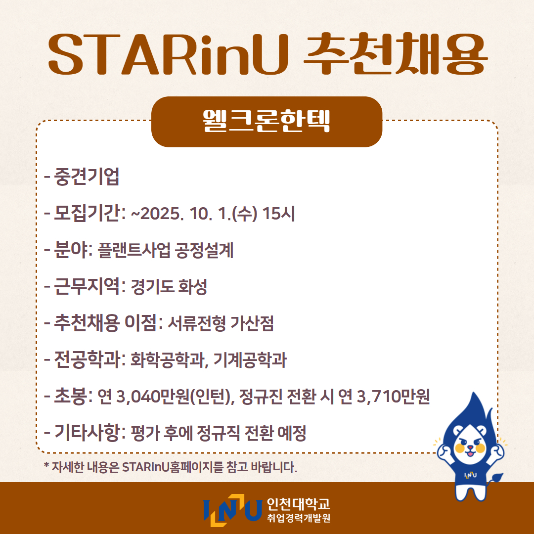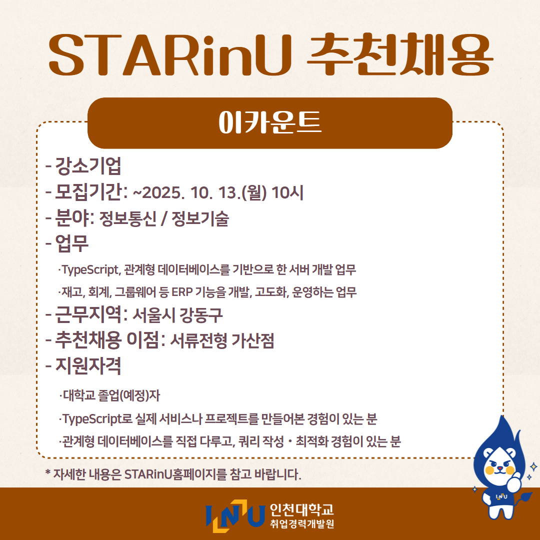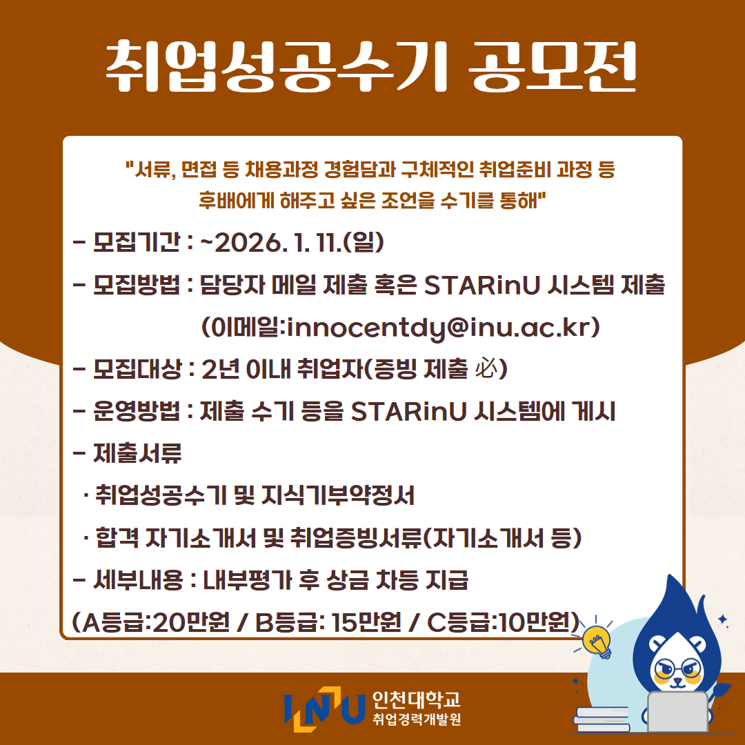 fnctId=bbs,fnctNo=600 [취업경력개발팀/대학일자리플러스] 9월 카드뉴스 글번호 413313 작성일 2025-09-30 수정일 2025-09-30 작성자 독어독문학과 (032-835-8130) 조회수 561 첨부파일 첨부파일이(가) 없습니다. 다음글 [대학일자리플러스센터] 인천대학교 2025년 졸업생 특화 오프라인 현직자 직무 멘토링(2025.10.22 10:00~17:00) 정연서 2025-10-10 11:14:01.0 이전글 [취업경력개발원 및 대학일자리플러스센터] 10월 프로그램 정연서 2025-09-30 11:26:57.0 목록