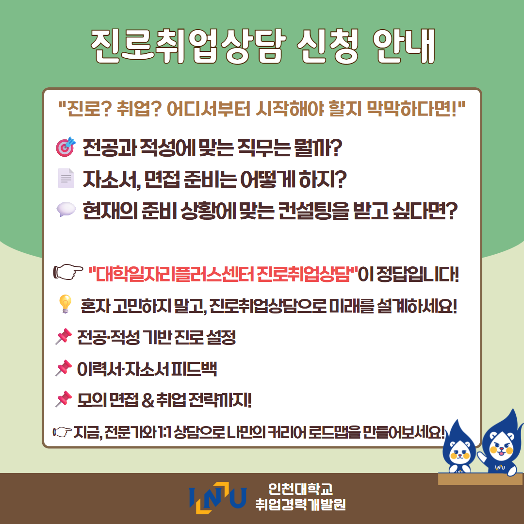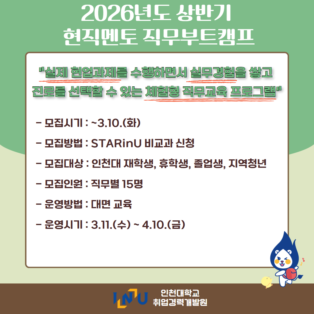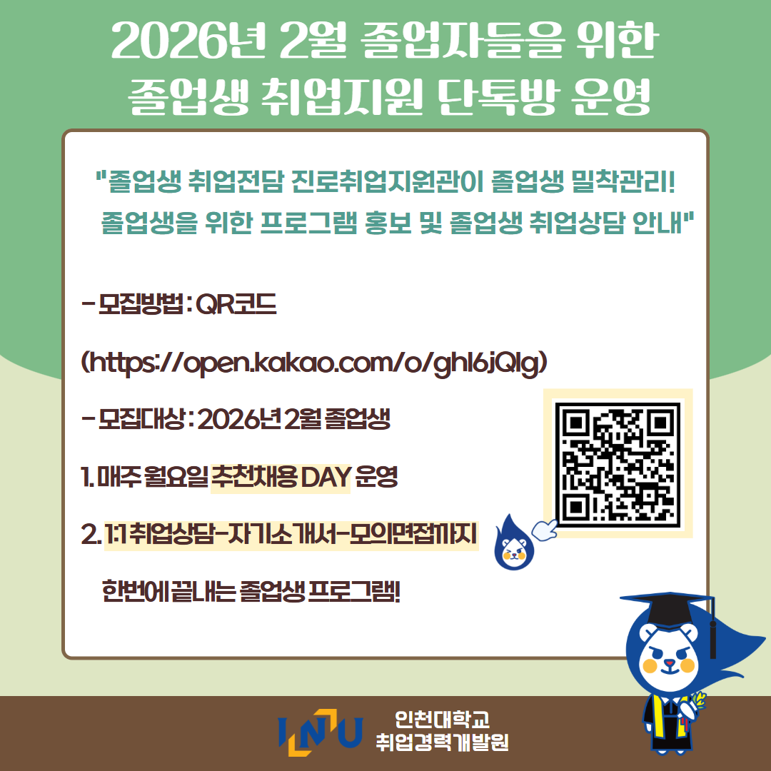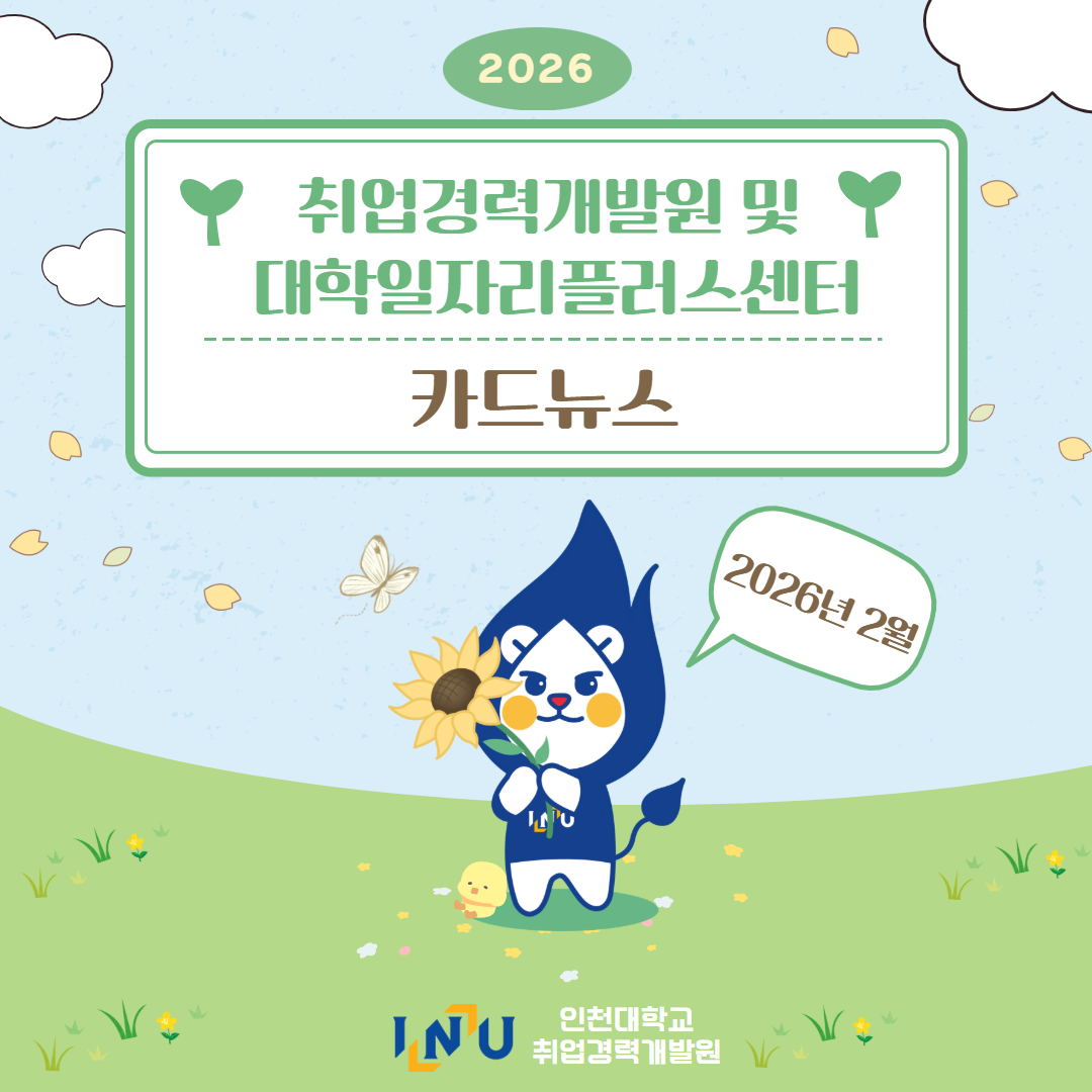 fnctId=bbs,fnctNo=600 [취업경력개발팀/대학일자리플러스] 2월 카드뉴스 글번호 420373 작성일 2026-03-04 수정일 2026-03-04 작성자 독어독문학과 (032-835-8130) 조회수 383 첨부파일 첨부파일이(가) 없습니다. 다음글 [채용설명회] 인천지방법원 채용설명회 정연서 2026-03-05 10:43:24.0 이전글 [취업경력개발팀/대학일자리플러스] 3월 프로그램 정연서 2026-03-04 09:18:15.0 목록