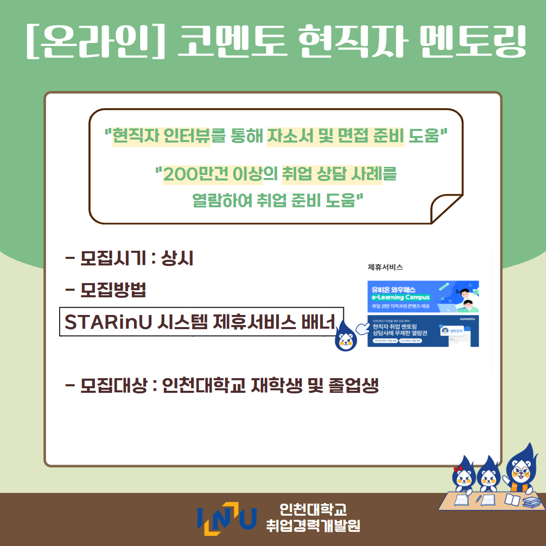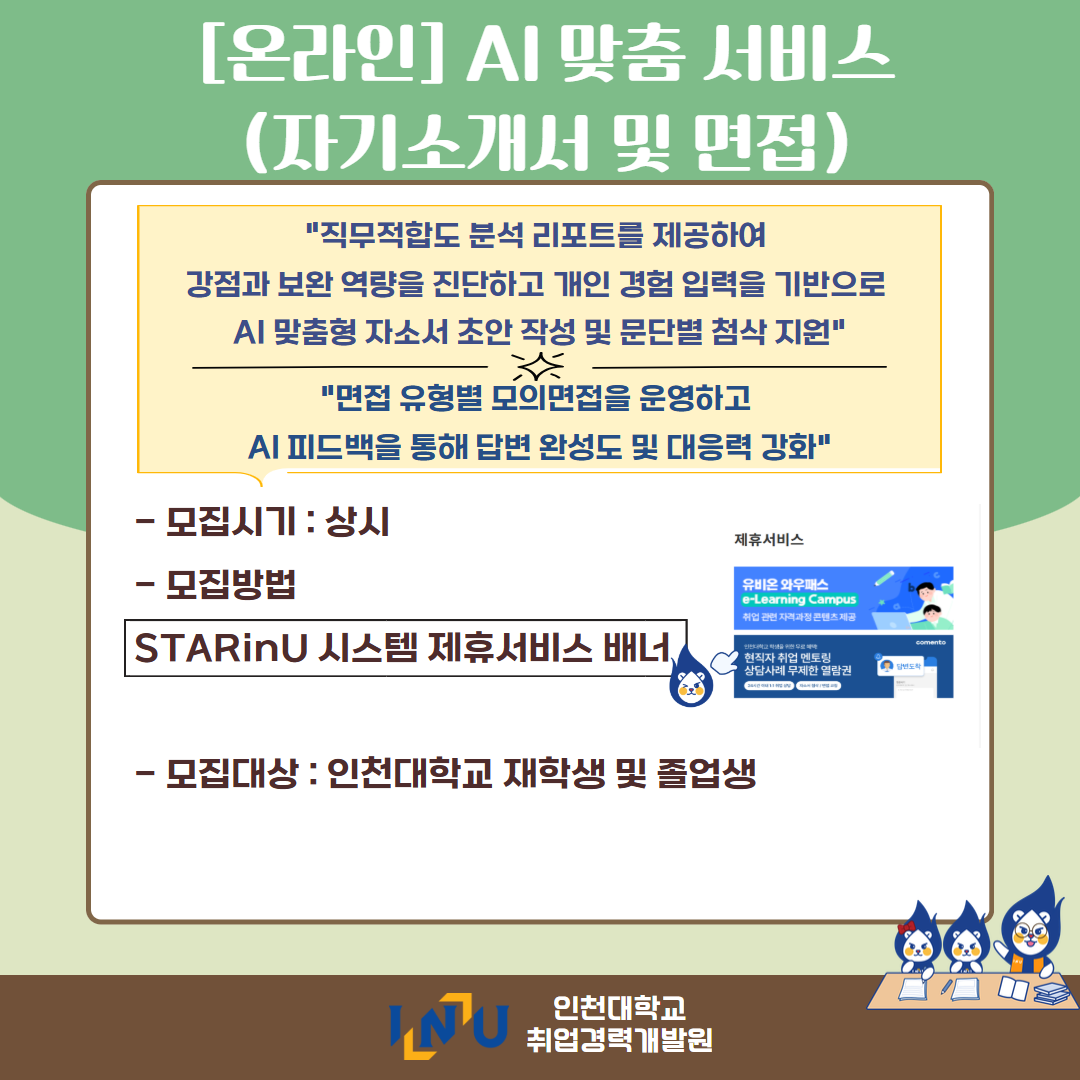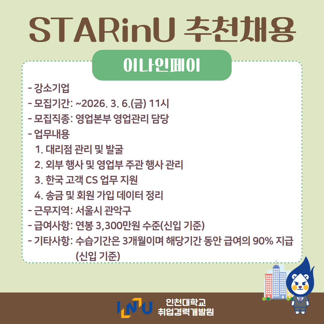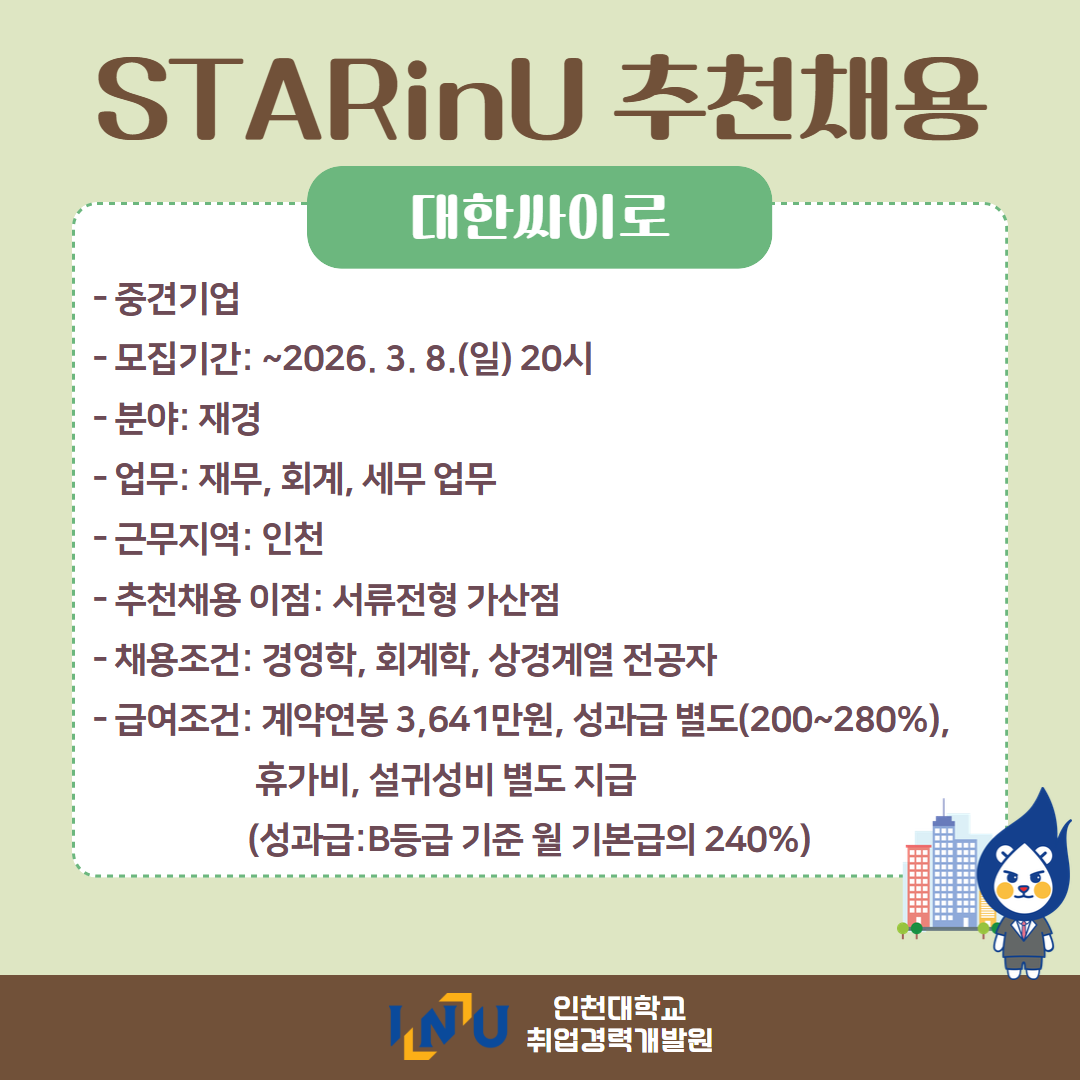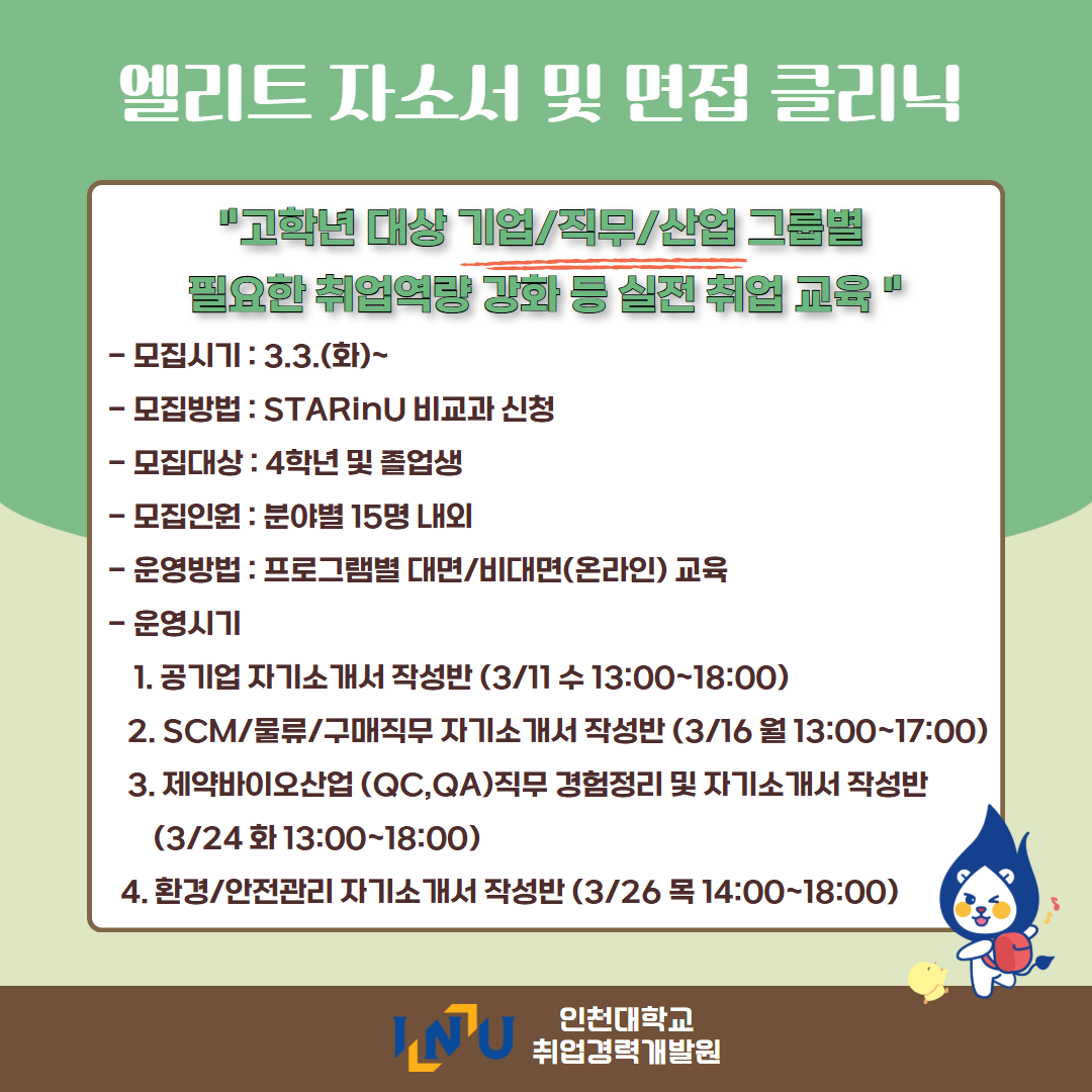 fnctId=bbs,fnctNo=600 [취업경력개발팀/대학일자리플러스] 2월 카드뉴스 글번호 420373 작성일 2026-03-04 수정일 2026-03-04 작성자 독어독문학과 (032-835-8130) 조회수 383 첨부파일 첨부파일이(가) 없습니다. 다음글 [채용설명회] 인천지방법원 채용설명회 정연서 2026-03-05 10:43:24.0 이전글 [취업경력개발팀/대학일자리플러스] 3월 프로그램 정연서 2026-03-04 09:18:15.0 목록